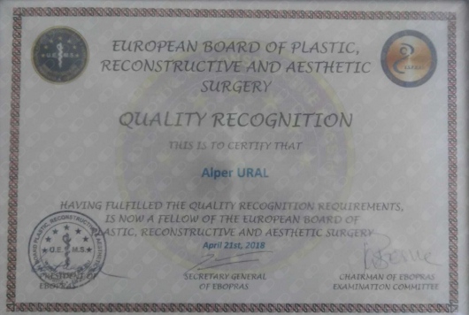 1. FEBOPRAS Fellowship Certificate/ QUALITY RECOGNITION, EUROPEAN BOARD OF PLASTIC RECONSTRUCTIVE AND AESTHETIC SURGERY FELLOWSHIP ( FEBOPRAS ) / AVRUPA PLASTIK CERRAHI YETERLIK BELGESI, BRÜKSEL/BELÇIKA, Sertifika, 2018 (Uluslararası)