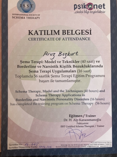 Aruz hocadan önce çok hekime gittim. Hem terapi gördüğüm hem de düzenli ilaç kullandığım uzun zamanlar olmuştu. Genel olarak günlük hayatımı etkileyen kaygılarım ve geleceğe dair umutsuzluklarım vardı. Aruz hocanın desteği ile kaygılarımın, geleceğe dair korkularımın ve terapiye karşı olan önyargılarımın üstesinden geldim. Her zaman güler yüzle karşılandım. Güvenli bir ortamda olduğumu hep hissettim.