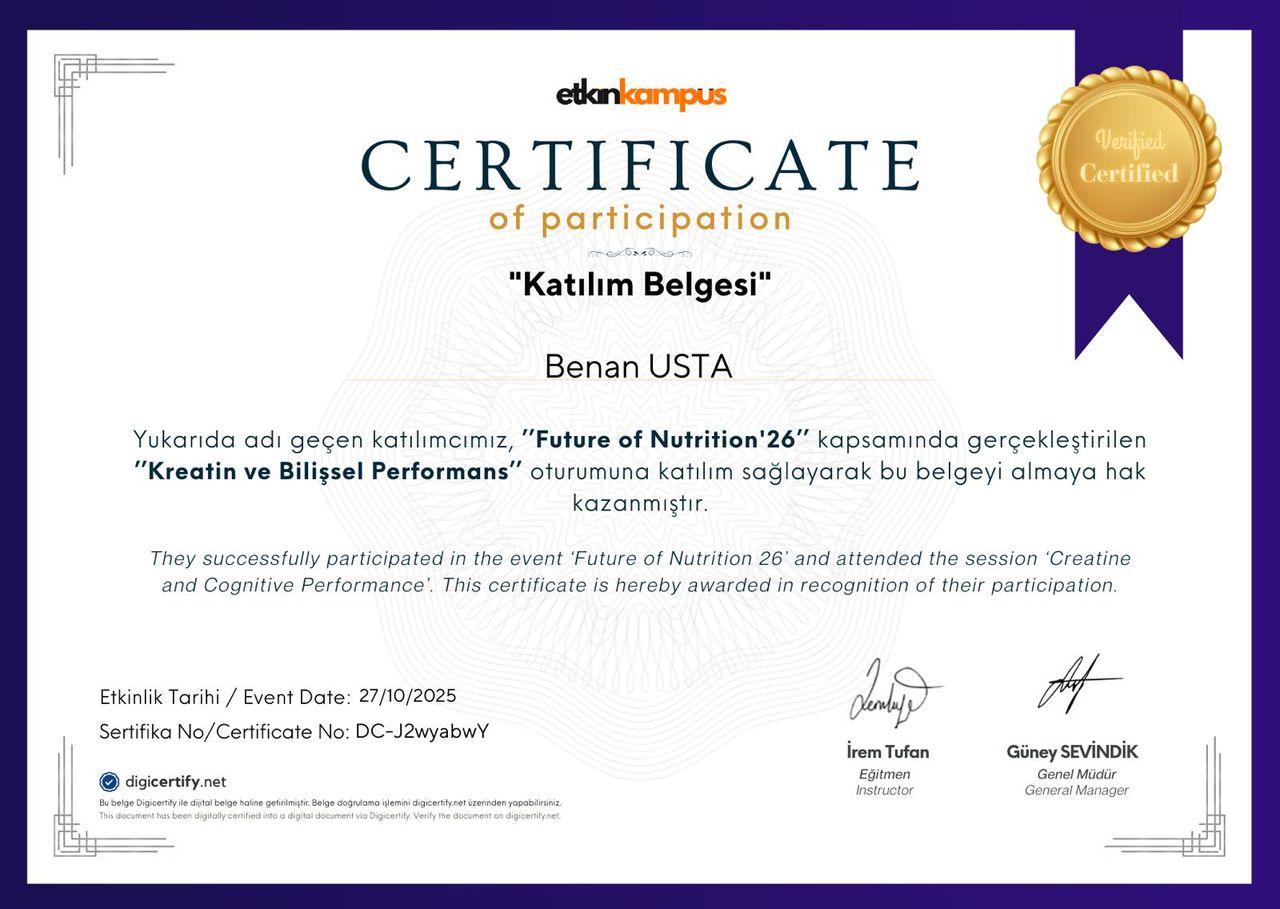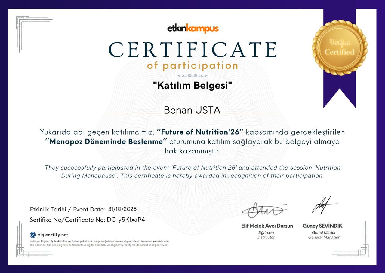 Diyetisyen Benan Usta Beslenme biliminin hem sanatı hem de bilimi olduğuna inanan, her bireyin bedenini ve yaşamını bütüncül olarak ele alan bir diyetisyenim. Mesleğimin merkezinde yalnızca “kilo yönetimi” değil; sağlıklı, sürdürülebilir, psikolojik olarak dengeli bir yaşam kültürü oluşturmak yer alır. Eğitim ve Uzmanlık Alanlarım Beslenme ve Diyetetik lisans eğitimimle birlikte; yıllar içinde farklı alanlarda kendimi geliştirdim. Uzmanlıklarım arasında: • Kilo yönetimi ve vücut kompozisyon analizi • Sporcu beslenmesi • Klinik beslenme (diyabet, hipertansiyon, gastrointestinal hastalıklar, renal beslenme, vb.) • Gebelik ve emziklilik döneminde beslenme • Çocuk ve ergen beslenmesi • Yeme bozuklukları terapötik beslenmesi • Enteral ve parenteral beslenme • Fonksiyonel ve bütüncül beslenme yaklaşımları yer almaktadır. Mesleki Deneyim Kendi ofisimde aktif olarak danışan kabul etmekteyim. Her danışanımı yalnızca bir “program” değil, bir yaşam dönüşüm süreci olarak görürüm. Ölçümlerden menülere, ruh halinden besin tercihlerine kadar her detayı kişiye özel olarak planlarım. Ayrıca mesleki alanda sürekli yenilenen bir bakış açısıyla çalışır; güncel bilimsel gelişmeleri yakından takip ederim. Çalışma Felsefem • “Mükemmellik değil, sürdürülebilirlik.” • “Yasak yok, denge var.” • “Beslenme sadece tabakta değil; zihinde, duyguda, yaşam tarzında başlar.” Kendimden Bahsedersem… Disiplinli ama içten bir yapıya sahibim. Danışanlarımla aramda güvene dayalı, motivasyonel bir bağ kurarım. Bilimi duyguyla, analitiği estetikle harmanlamayı severim. Ofisimdeki her görüşme, bir “iyileşme ve farkındalık yolculuğu” gibidir. Misyonum Her bireyin kendine özgü bir “doğal denge” noktası vardır. Benim misyonum, kişiyi o noktaya taşıyan beslenme dengesini bilimsel ve içten bir yaklaşımla yeniden kurmaktır.