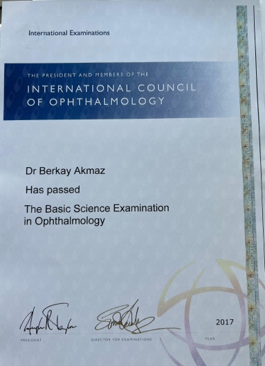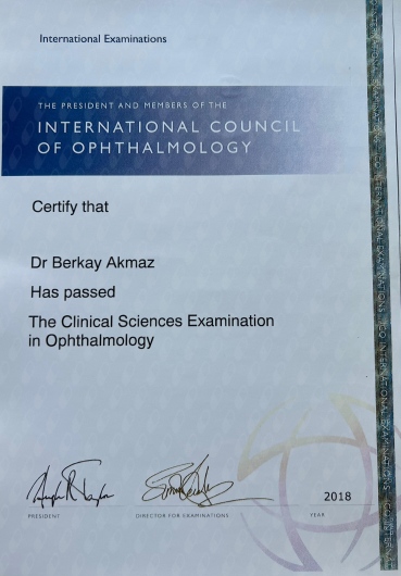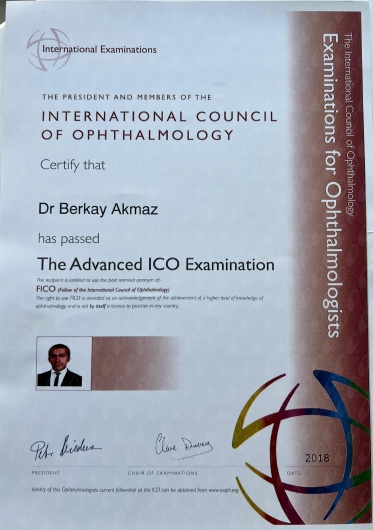 2018 yılında International Council of Ophtalmology ileri düzey sınavında başarılı olarak FICO (Fellow of International Council of Ophthalmology) ünvanını kazandım.