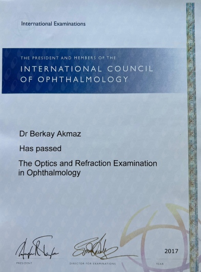 2017 yılında International Council of Ophtalmology Optik Refraksiyon, Temel bilimler, Klinik bilimler sınavlarında başarı ile geçtim.