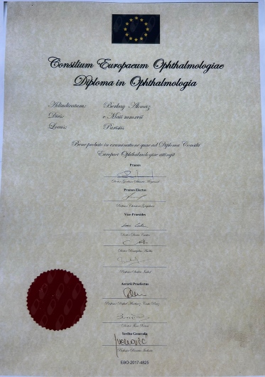 2017 yılında Paris’ de yapılan Avrupa Board sınavında başarılı olarak Avrupa Oftalmoloji Konseyi Diplomasını ve FEBO ünvanını kazandım.