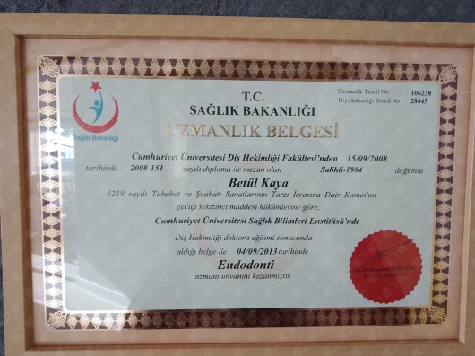 2013 yılında Cumhuriyet Üniversitesi Diş Hekimliği Fakültesi Hastanesi'ndeki görevini tamamlayarak Endodonti Uzmanı ve Endodonti Doktora Diş hekimi ünvanı ile Sivas ilinden ayrılmıştır.