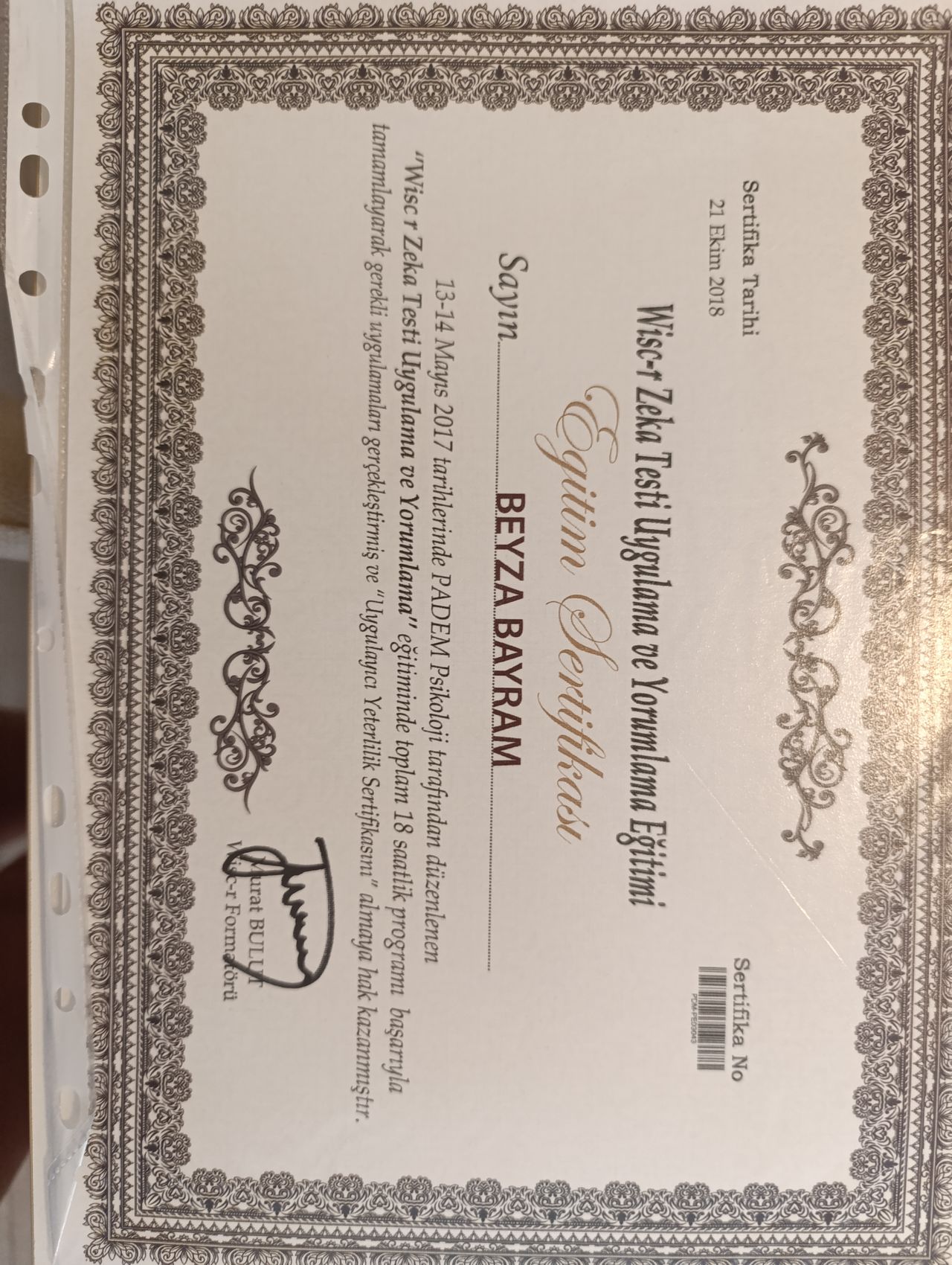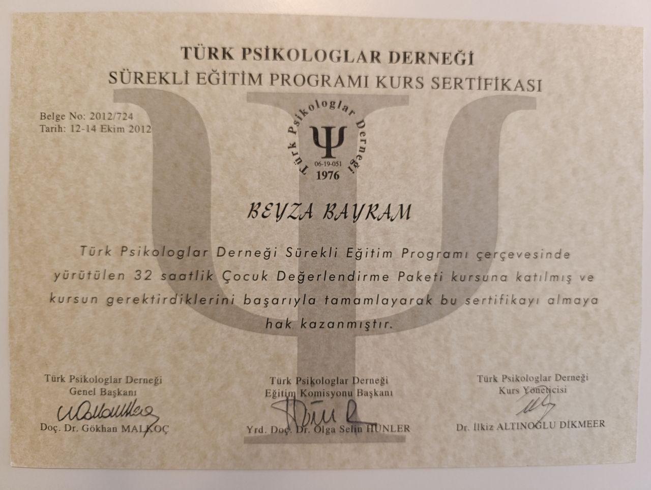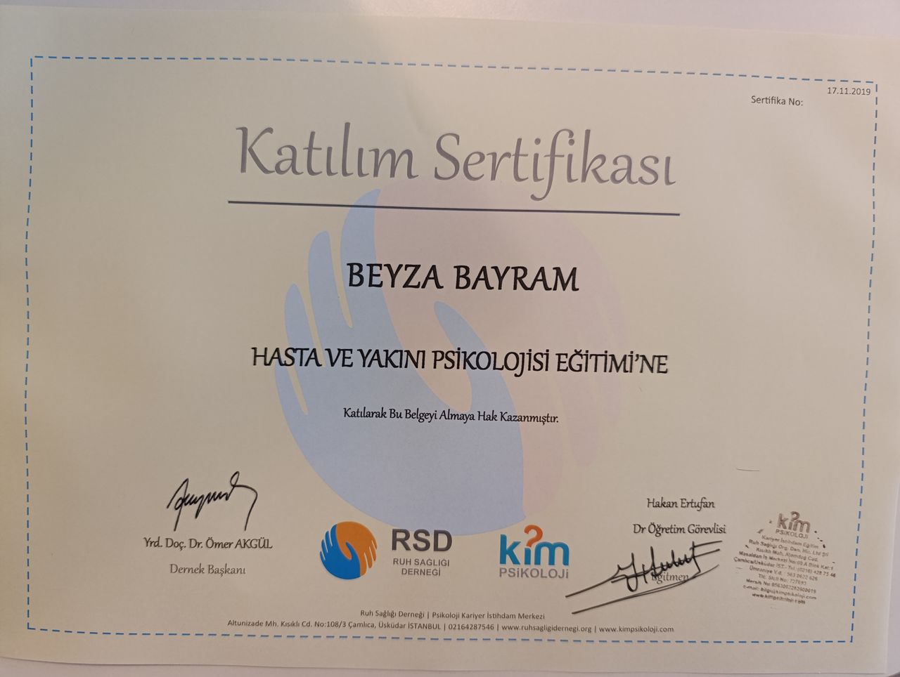 Klinik Psikolog Beyza BAYRAM ESKİ, tam burslu okuduğu Haliç Üniversitesi Psikoloji bölümünden 2012 yılında mezun olmuştur. 2015 yılında yüksek lisansını Üsküdar Üniversitesi Klinik Psikoloji bölümünde “Değerler Eğitiminde Montessori Yöntemi” konulu tez çalışmasıyla tamamlamıştır. Aynı yıl İstanbul Ticaret Üniversitesi’nde Pedagojik Formasyon eğitimini tamamlamıştır.