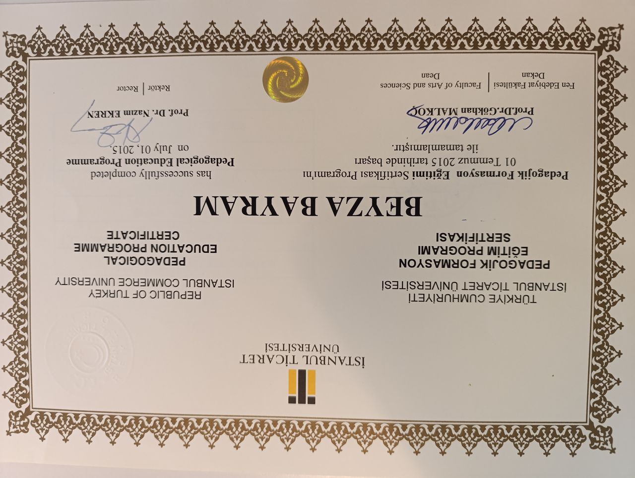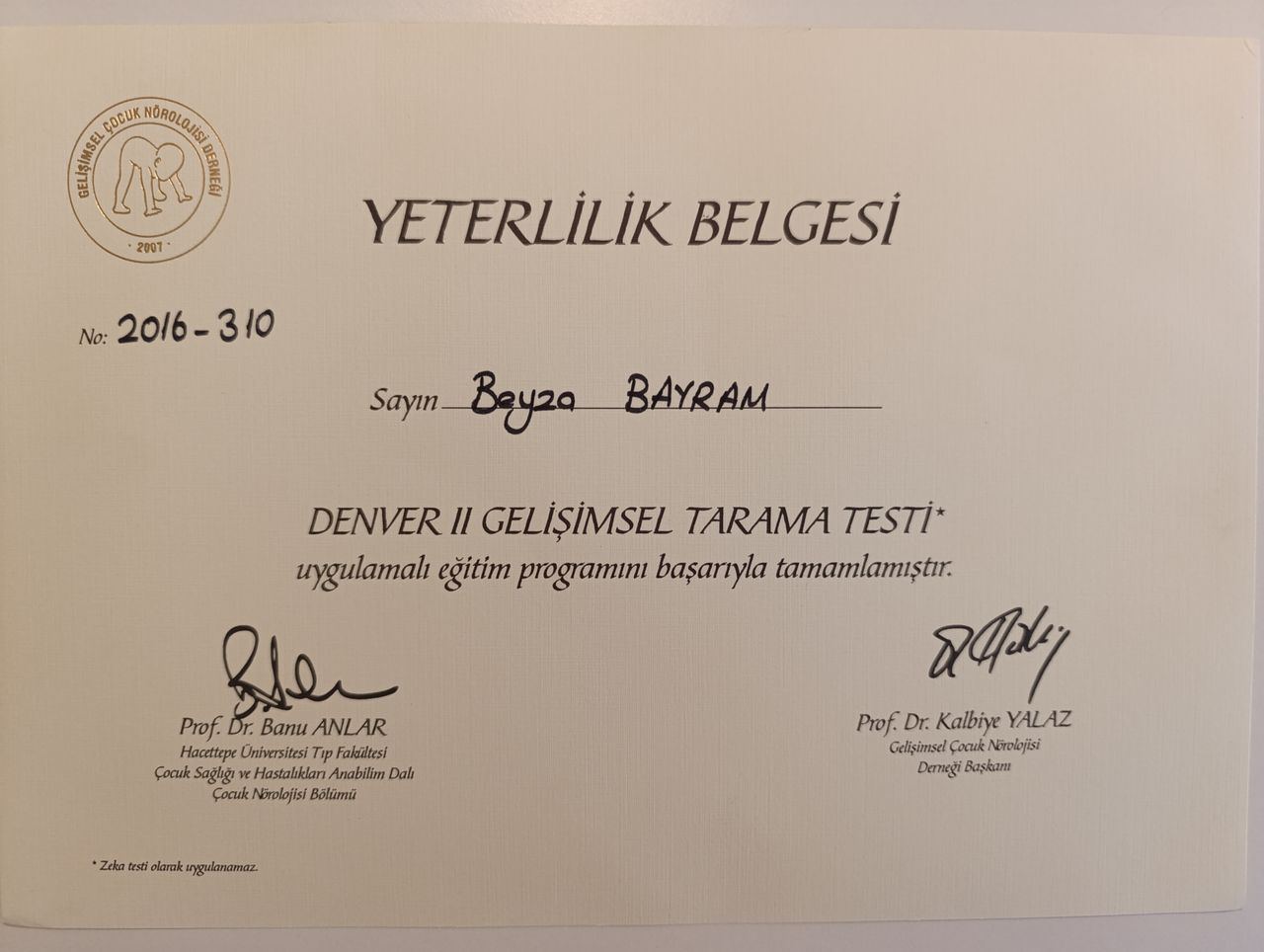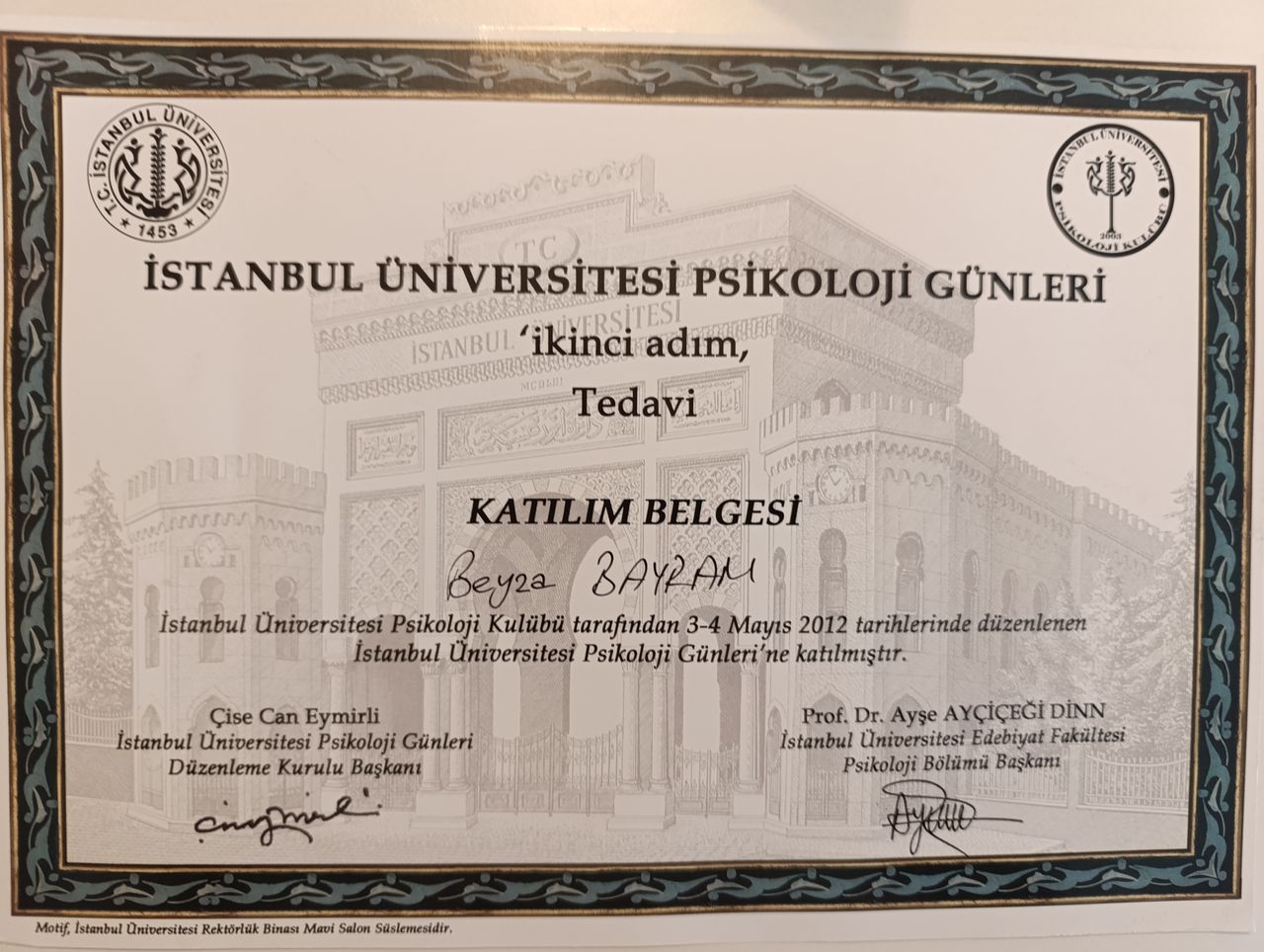 Klinik Psikolog Beyza BAYRAM ESKİ, tam burslu okuduğu Haliç Üniversitesi Psikoloji bölümünden 2012 yılında mezun olmuştur. 2015 yılında yüksek lisansını Üsküdar Üniversitesi Klinik Psikoloji bölümünde “Değerler Eğitiminde Montessori Yöntemi” konulu tez çalışmasıyla tamamlamıştır. Aynı yıl İstanbul Ticaret Üniversitesi’nde Pedagojik Formasyon eğitimini tamamlamıştır.