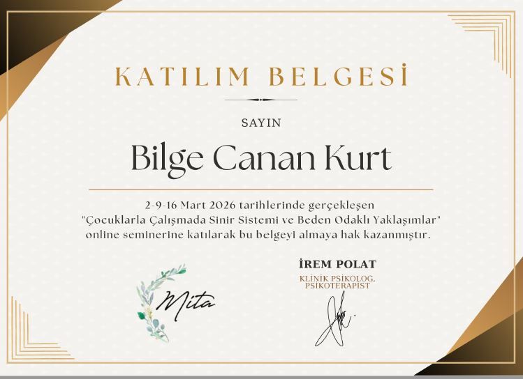 Aldığı eğitimler; • Çocuk ve Ergenlerde Bilişsel Davranışçı Terapi (Modül1 ve Modül2) – Bilişsel Davranıçı Terapiler Derneği (Doç. Dr. Vahdet Görmez - Dr. M. Hakan Türkçapar) • Deneyimsel Oyun Terapisi (Modül1, Modül2, Orta Düzey, Prof. Düzey) – Psikoloji İstanbul (Nilüfer Devecigil - Byron E. Norton) • SE Playshop (Somatik Deneyimleme Türkiye) • Psikanalitik Psikoterapi (Rorschach ve Projektif Testler Derneği) • Objektif Çocuk Değerlendirme Testleri – Psk. Dan. Osman Erkan • Moxo Testi – Moxo Türkiye • Aile Danışmanlığı – Milli Eğitim Bakanlığı • Attentioner Dikkat Eksikliği Programı – Uzm. Dr. Hülya Bingöl Çağlayan • Deneyimsel Oyun Terapisi Süpervizyonu - Byron Norton • Dinamik Psikoterapi - Doğan Şahin