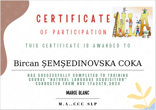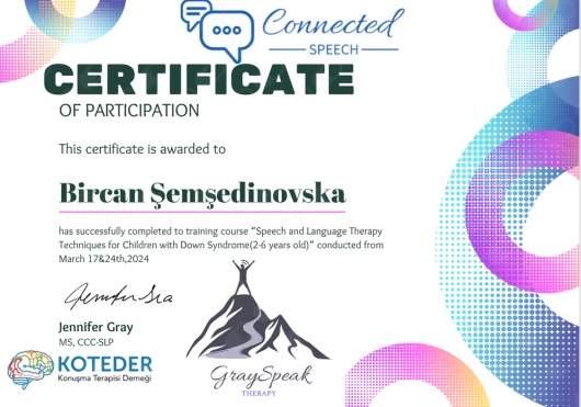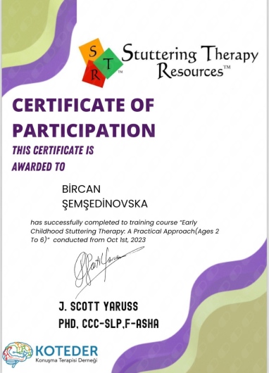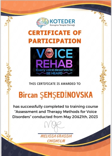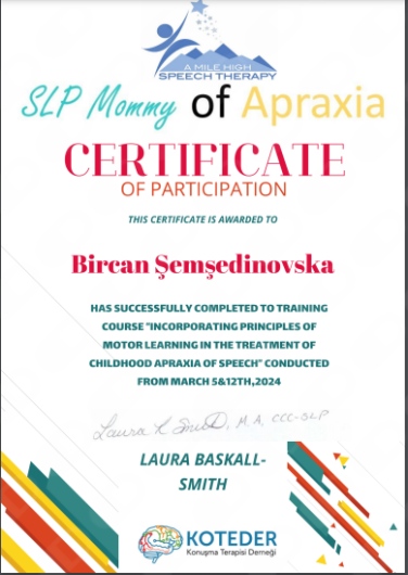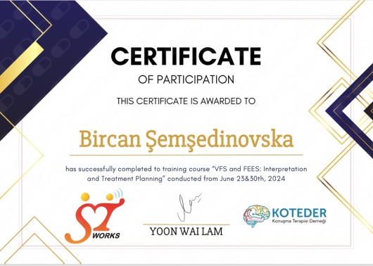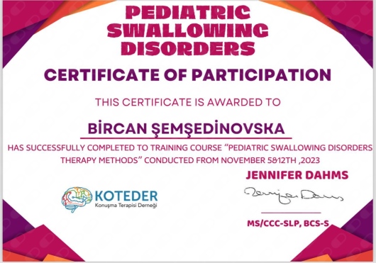 Dil ve konuşma Terapilerine Ek olarak Uluslarası alanyazında geçerliliği olan Beslenme Bozukluğu eğitimlerine katılarak Beslenme Terapisti ünvanını almıştır.