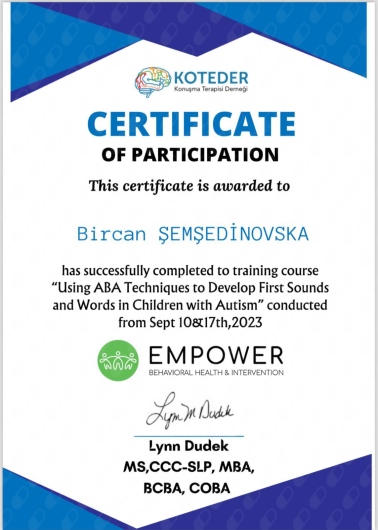 Kızımın konuşma geriliği için eğitmen arayışımız sonrasında kesişti yollarımız. Bircan hocamız profesyonel eğitimi kullandığı ekipmanlar sayesinde 4 ayda bile gözle görülür bir değişim yaşandı.Eğitim esnasında mutlu öğrenci ve öğretmen ilişkisi sayesinde yaşanan bu ilerleme doğru yolda olduğumuzu gösteriyor.Veli olarak tüm seansın neşe içinde gecmesi ve olumlu sonuclar doğurduğunu dile getirmek isterim.Geç oldu onu bulmamız ancak iyi ki Bircan Şemşedinovska