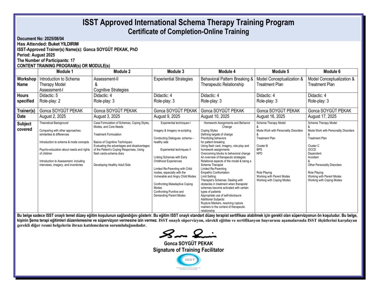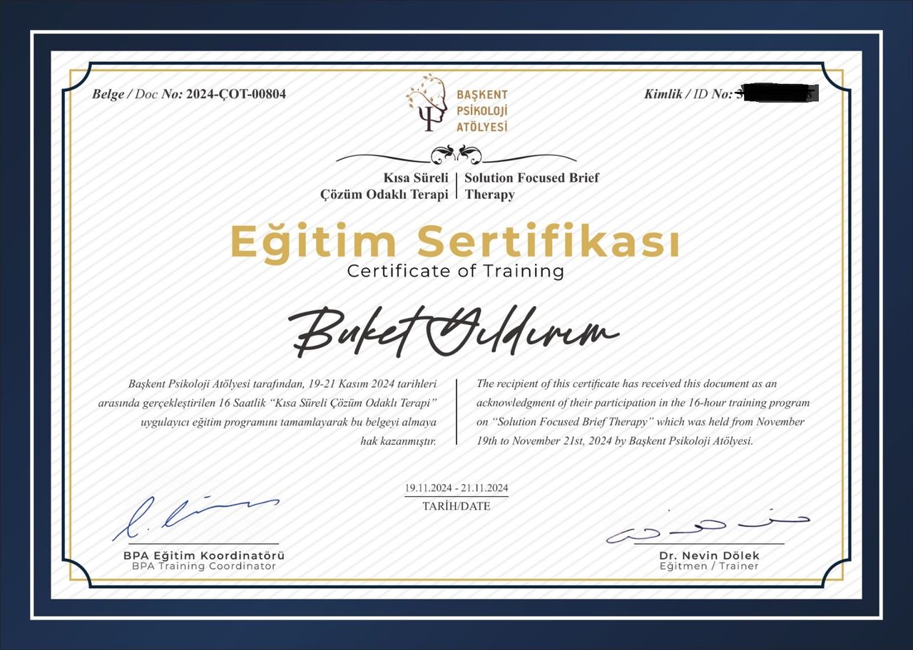 Son olarak, International Society for Schema Therapy (ISST) onaylı "Şema Terapi Temel Düzey Eğitimini" Prof. Dr. Gonca Soygüt Pekak'tan alarak eğitimin ilk basamağını tamamladım.