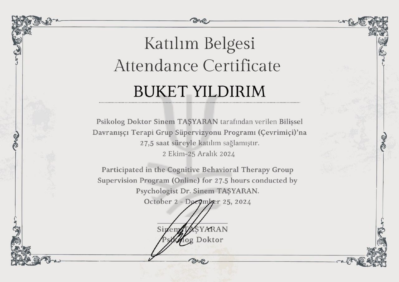 Buket Hanım ile gerçekleştirdiğimiz seanslarda kendimi rahatça ifade edebildim ve anlaşıldığımı hissettim. Bazen hayat koşulları nedeniyle zorlandığım anlarda bile süreci sürdürebilmem için gösterdiği anlayış ve destek benim için çok değerliydi. Bu süreçte kendime dair farkındalığımın arttığını hissediyorum.