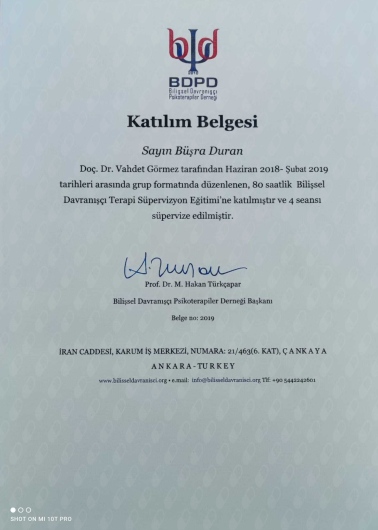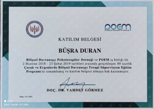 Bilişsel Davranışçı Terapi ( BDT), Kabul ve Kararlılık Terapisi ( ACT), EMDR terapisi eğitimlerini alanındaki yetkin isimlerden aldı. Halen Bilişsel Davranışçı Terapiler Derneği tarafından düzenlenen akredite çocuk - ergen süpervizyonu eğitimlerine devam etmektedir.