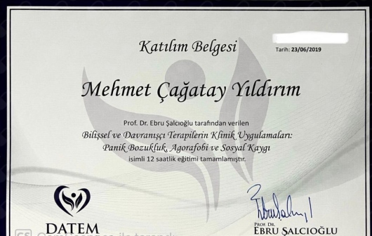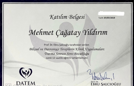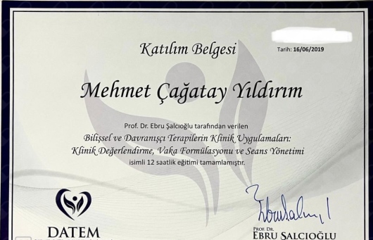 2019 Davranış Araştırmaları ve Terapileri Merkezi bünyesinde Bilişsel Davranışçı Terapi Eğitimi Sertifikası almıştır.