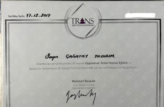 2017 Trans Eğitim ve Danışmalık Merkezi bünyesinde Hipnoterapi Eğitimi Sertifikası almıştır.