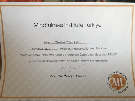2019 Temmuz ayında Doç.Dr.Zümra Atalay'dan "Mindfulness Temelli Stres Azaltma (MBSR)" eğitimini aldım.