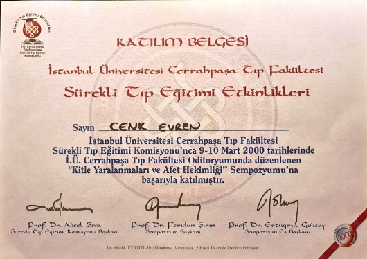 İstanbul Üniversitesi Cerrahpaşa Tıp Fakültesi’nden 2000 yılında mezun olan Prof. Dr. Cenk Evren, uzmanlık eğitimini İstanbul Kartal Dr. Lütfi Kırdar Eğitim ve Araştırma Hastanesi’nde 2001-2005 yılları arasında tamamlamıştır.