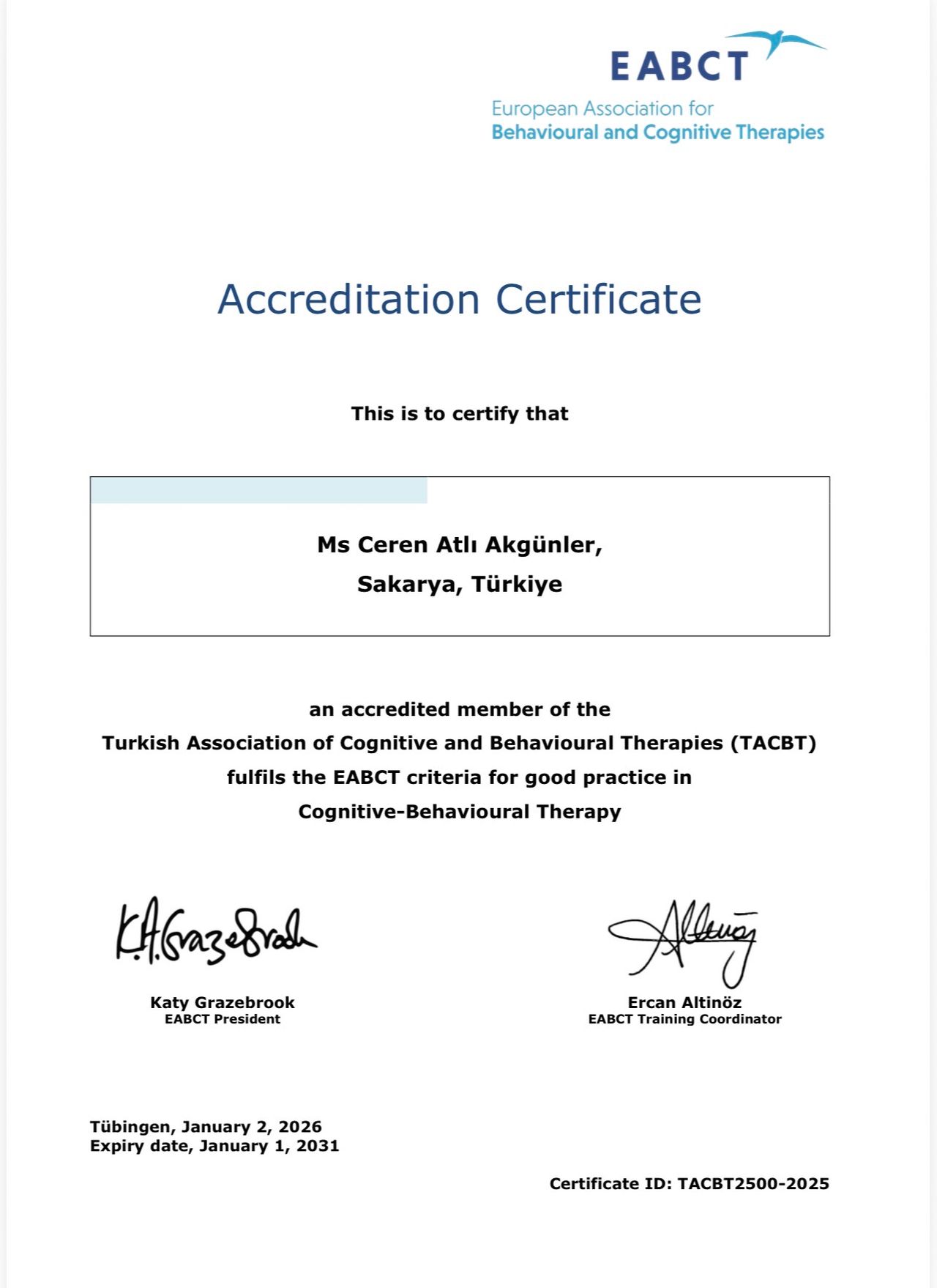4 yıl süren EABCT onaylı Kognitif Davranışçı Terapi eğitimini 2025 yılında tamamlayarak Avrupa Akredite KDT Terapist olmaya hak kazandım. Kl. Psk. Dr. Sevinç Göral Alkan ile birlikte ISST onaylı Şema Terapi süpervizyon sürecine ve EMDR Avrupa onaylı EMDR Terapi süpervizyon sürecine devam ediyorum. Türk Psikologlar Derneği, EMDR Derneği ve KDTD Derneği'ne üyeyim. Kurucusu olduğum Sağlık Bakanlığı’na bağlı ruhsatlı Klinik Psikolog Ceren Atlı Akgünler Özel Sağlık Meslek Hizmet Birimi’nde çocuk, ergen ve yetişkinlere özel psikoterapi ve danışmanlık hizmeti vermekteyim.