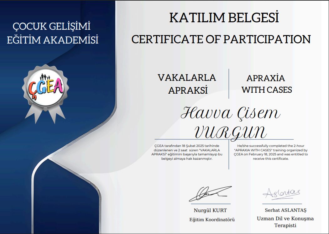 İstanbul Gelişim Üniversitesi Dil ve Konuşma Terapisi Bölümü mezunuyum. Lisans eğitimim süresince çocuklarda dil, konuşma ve iletişim bozuklukları üzerine yoğunlaşarak kapsamlı teorik ve uygulamalı eğitimler aldım.