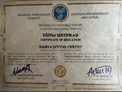 Damla Şevval Erkent, Anadolu Psikoterapiler Derneği tarafından verilen Bilişsel Davranışçı Terapi Eğitimi’ni (80 saat) ve Varoluşçu Akademi Türkiye tarafından verilen Temel Varoluşçu Analiz Eğitimini (120 saat) tamamladıktan sonra Federation for Existential Therapy in Europe (FETE) bağlı olarak çalışan varoluşçu yönelimli bir terapist olabilmek için formasyon eğitimlerine devam etmektedir.