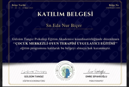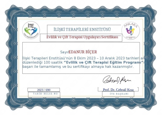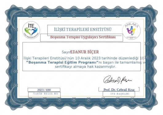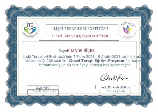 Bilişsel Davranışçı Terapi, Şema Terapi, EMDR Terapisi, Duygu Odaklı Çift Terapisi, Cinsel Terapi, Kısa Süreli Çözüm Odaklı Terapi ve Çocuk Merkezli Oyun Terapisi teorik eğitimini ve süpervizyonunu tamamlamıştır.