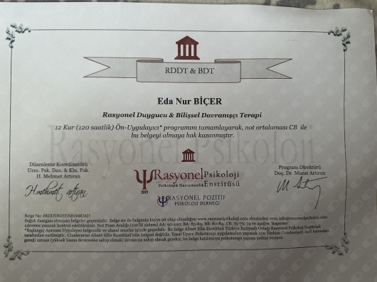 Uzman Klinik Psikolog Eda Nur BİÇER, İstanbul Medeniyet Üniversitesi Psikoloji bölümünden yüksek onur derecesi ile mezun olmasının ardından birincilikle kazandığı İstanbul Rumeli Üniversitesi Klinik Psikoloji Tezli Yüksek Lisans (%100 burslu) eğitimine başlamıştır.