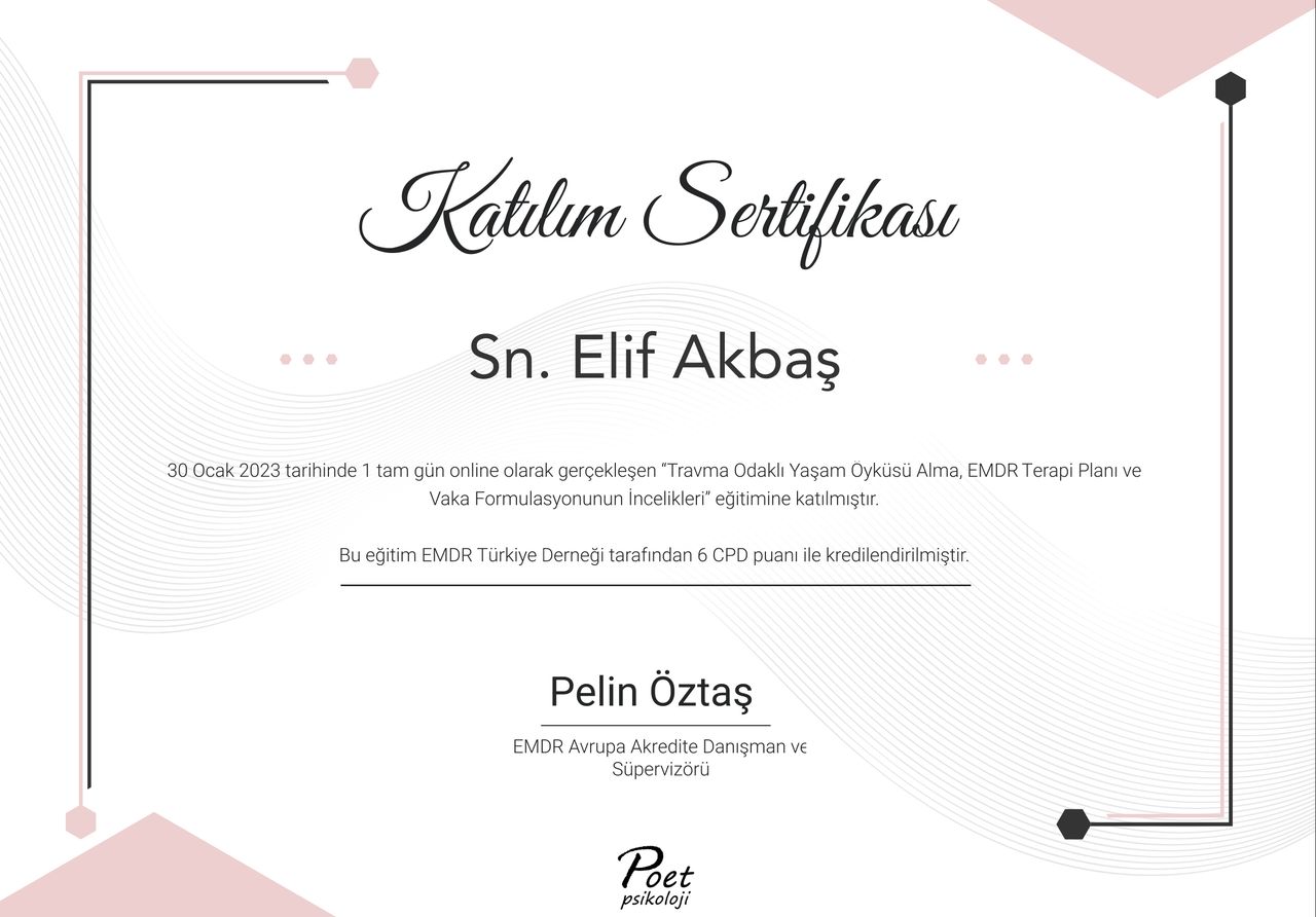 Elif Hanım'a Yks sürecim için başvurmuştum,sınav sonucunda olabileceğini düşündüğüm en kötü senaryo hakkında EMDR ile çalıştık.Gerçekten faydalı olduğunu düşünüyorum.Aslında bu sınav sürecinin sadece sınava çalışmaktan ibaret olmadığını bizlerin en azından benim geçmişden gelen çalışmaya,başarıya olan bakıç açımı ve de çoğu konulardaki sert düşüncelerimin de büyük etkisinin olabileceğini öğrenedim.Elif Hanım'ın yönlendirmesiyle daha esnek düşebilmeyi hayatıma geçirmeye başladığımı söyleyebilirim.Sizi her zaman güzel,samimi bir gülümsemeyle karşılaması, yargısızca dinlenilmek ve terapinin etkilerini hayatımda görebilmek beni süreç boyunca mutlu eden şeylerdi.Elif Hanım'ı içtenlikle herkese öneririm.