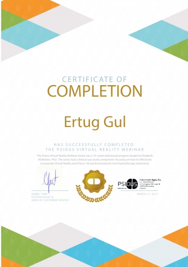 Sanal gerçeklik terapisi ile ilgili eğitimime 2016 yılı Şubat ayında, İspanya Barcelona’da Dr. Elizabeth McMahon ve Isabel Font yönetimindeki teorik ve pratik aşamalarda başladım daha sonra çalışma gruplarıyla devam ettim. Pilot uygulamaları süpervize ettim, ayrıca konu ile ilgili sertifiye edildim. Yine Klinik Psikoloji alanındaki master tezimi de Prof.Dr.Nevzat Tarhan ile sanal gerçeklik terapisi üzerine yazdım. Bunun yanında, sanal gerçeklik terapisi ile ilgili kitabımın yazım aşaması sürmektedir.