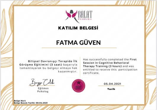 Sevgili Fatma Hanım'a, eşimin referansı ile tanıştım ve danışanı olduk. İyi ki de tanışmışız, günlük hayata dair takıntılar ile ilgiliydi çalışması. Kesinlikle tavsiye ediyorum, biz takıntılarımızın büyük çoğunluğunu hallettik ve biliyoruz ki her zaman bize kapısı açık.