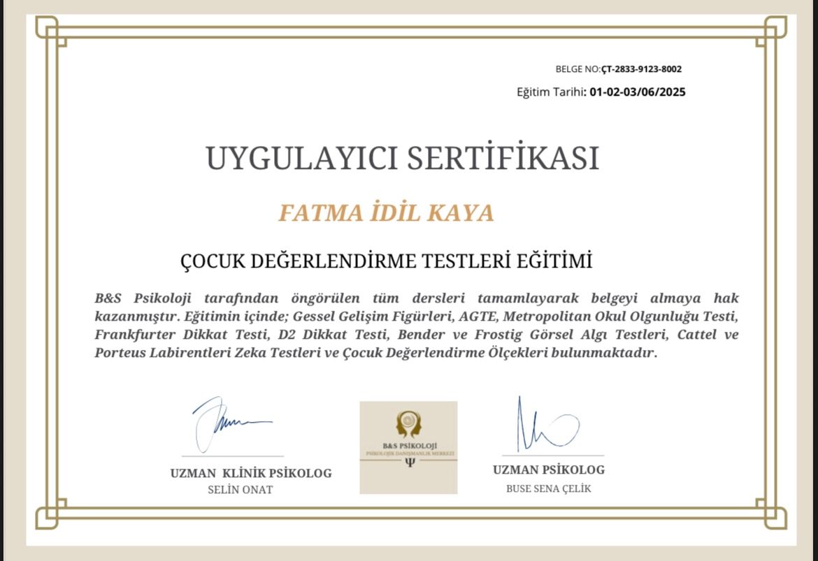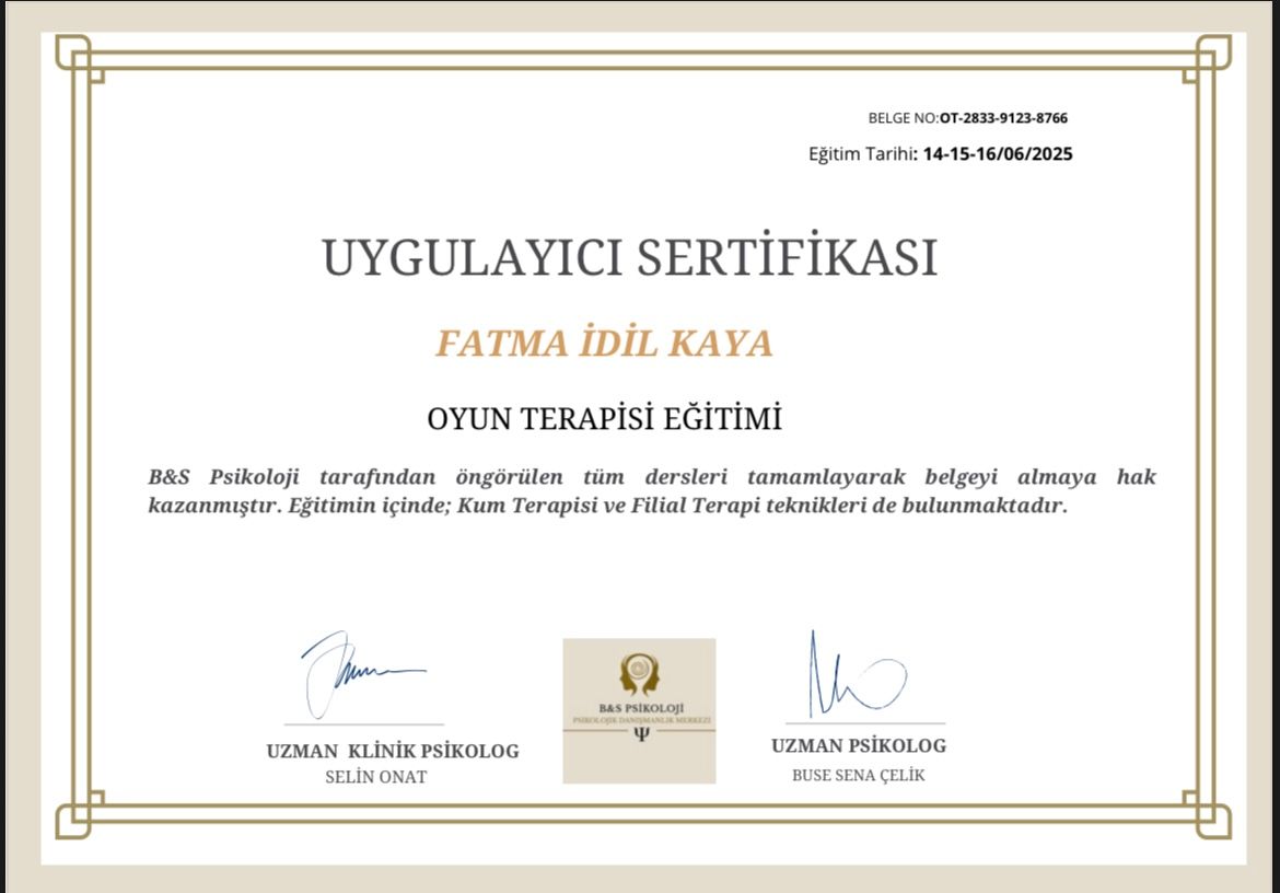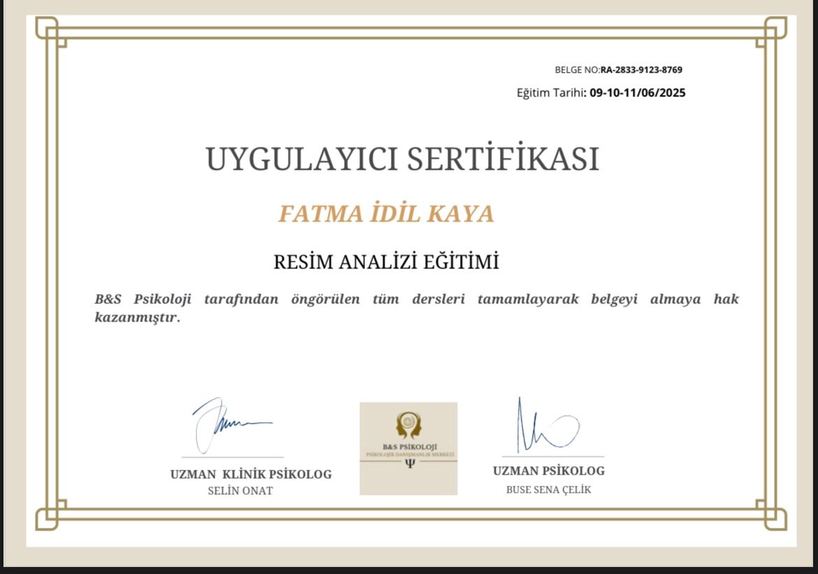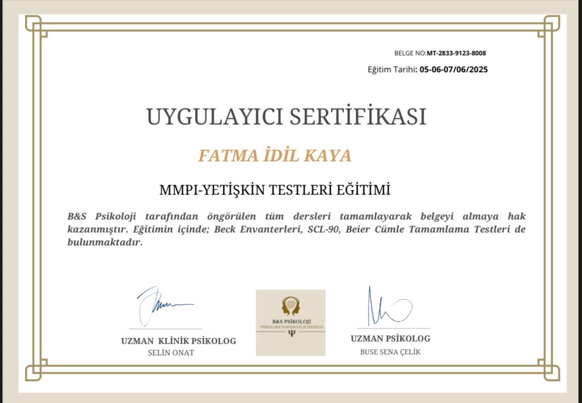 Ben, Fatma İdil Kaya, psikoloji alanında danışanlarımla güvene dayalı, anlayışlı ve birlikte yol aldığımız bir süreç yürütmeyi önemseyen bir psikoloğum.