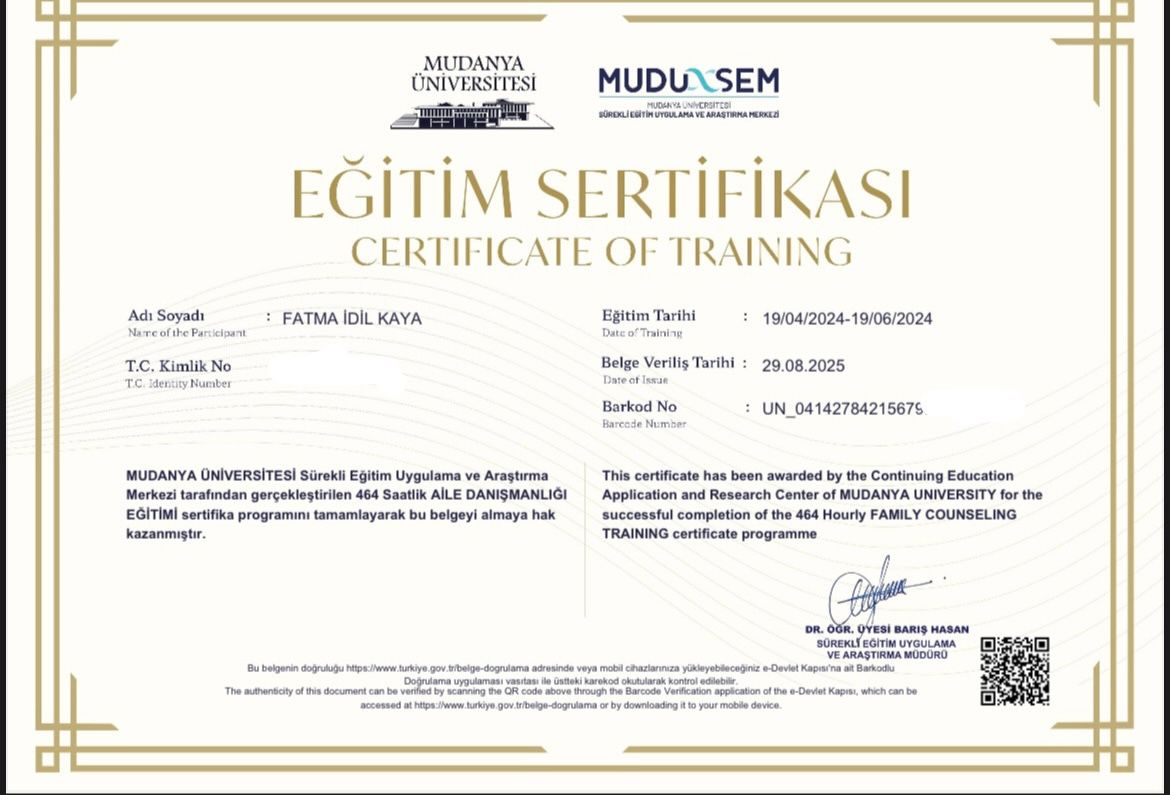 Bilişsel Davranışçı Terapi alanındaki eğitimimi, Bilişsel Davranışçı Psikoterapiler Derneği (BDPD) bünyesinde, Hakan Türkçapar eşliğinde tamamladım. Ardından Mehmet Zihni Sungur’dan Aile Danışmanlığı eğitimi alarak bireysel çalışmalarımı aile sistemi perspektifiyle zenginleştirdim.