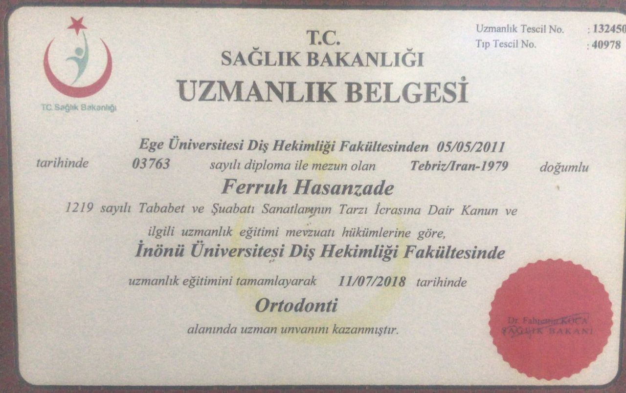 Uzm. Dt. Ferruh Hasanzade ,1979 Tebriz doğumludur. 2010 yılında Ege Üniversitesi Diş Hekimliği Fakültesi’nden mezun oldu. 2010-2014 yılları arasında Ankara’da görev yaptı. 2014 yılında girdiği Diş Hekimliği Uzmanlık Sınavı’nda üstün başarı göstererek İnönü Üniversitesi Ortodonti Anabilim Dalı’na girmeye hak kazandı. 2018 yılına kadar burada görev yaptı. 2018-2020 yılları arasında İzmit Konak Hastanesi’nde ortodonti uzmanı olarak çalıştı. Uzman Diş Grup Ağız ve Diş Sağlığı Merkezi’nde görevine devam etmektedir. Tel tedavileri, şeffaf plakla telsiz ortodonti ilgi alanları içindedir. 25 yıldır profesyonel olarak bisiklet sporu ve ahşap oymacılığı ile ilgilenmektedir. Evli ve 2 çocuk babasıdır.