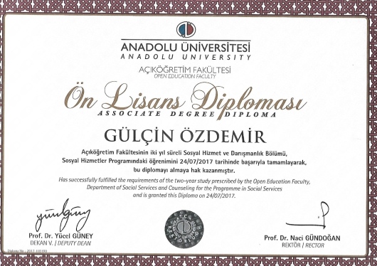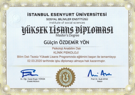 Yine psikoloji lisans eğitimi sürecinde merak duyduğu bir alan olan sosyal hizmet alanında bilgi edinmek amacıyla ikinci üniversite olarak başladığı Anadolu Üniversitesi Sosyal Hizmet ve Danışmanlık Bölümü’nden mezun olmuştur. Klinik Psikoloji alanındaki yüksek lisans eğitimini İstanbul Esenyurt Üniversitesi’nde “Ebeveynlik Tutumları İle Benlik Saygısı Arasındaki İlişki Üzerine Bir Derleme ”başlıklı bitirme projesiyle başarıyla tamamlamıştır.