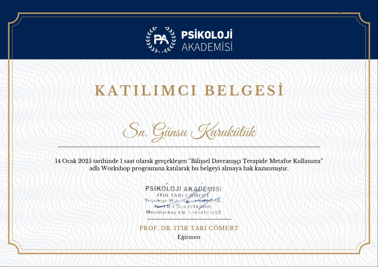 Günsu hocamla tavsiye üzerine tanıştım benim kaygı ve anksiyete bozukluğum vardı iki ayda çok yol aldım halen devam ediyorum kaygılarım azaldığı için anksiyete azaldı terapi sırasında Senin kolaylıkla ulaşacağın canı gönül den dinleyen takibini iyi yapan sorunları çözmek adına tabloya döken asıl görmen gereken yeri nazikçe anlatan psikoloji kitaplarıyla senin kendini geliştirmeni farkındalığının artması için ,yeni teknikler gördüğüm mesleğini severek yapan bir uzman psikolog herkese tavsiye ederim giderken hiç endişe duymadan gittiğim bir psikolog