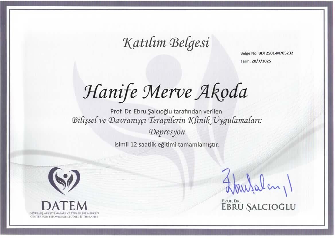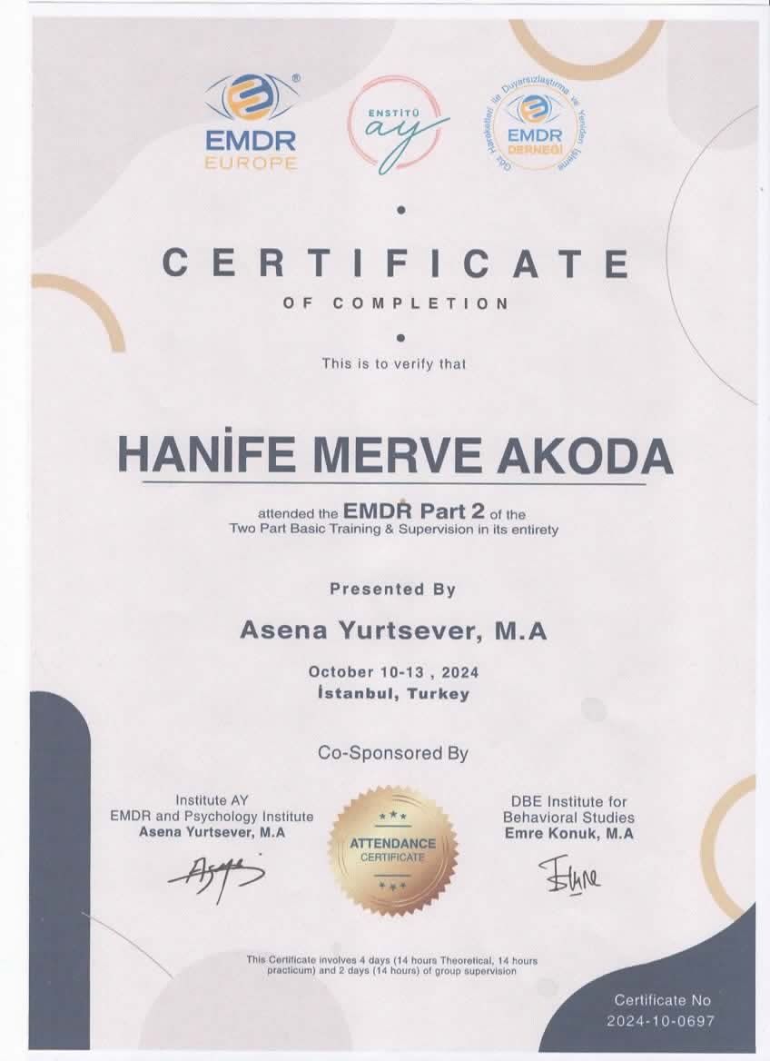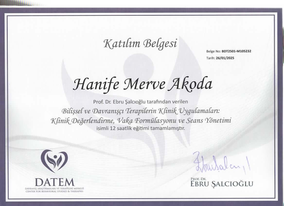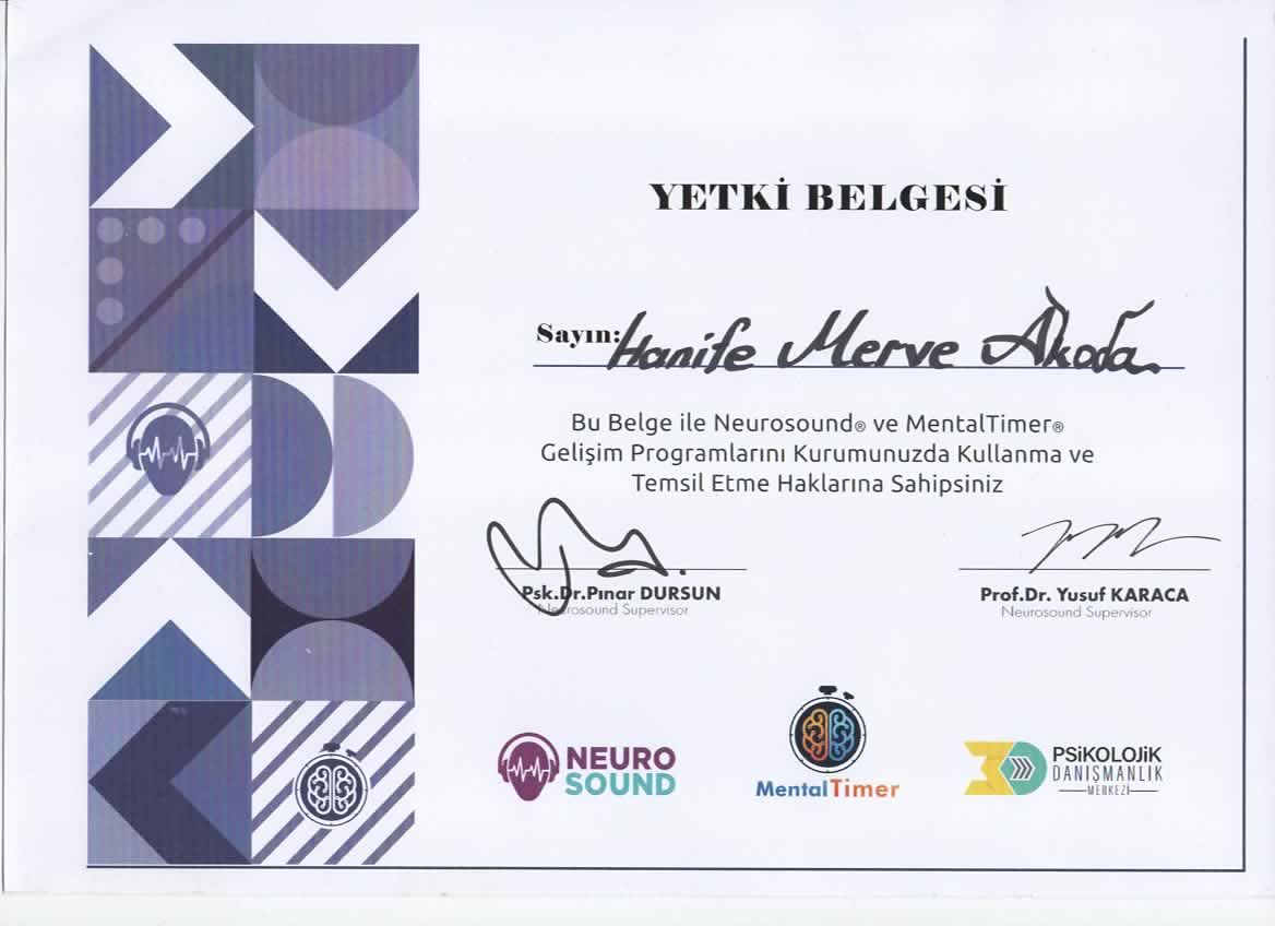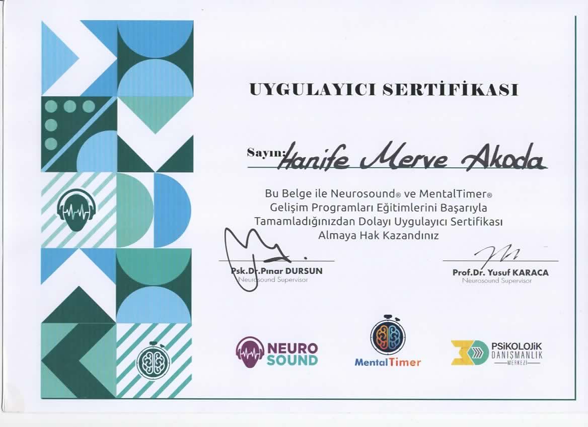 Kurucu Psikolog Hanife Merve Akoda MİA Psikolojik Danışmanlık ve Neurosound Dikkat Algı Geliştirme Merkezin de Hizmet vermektedir.
