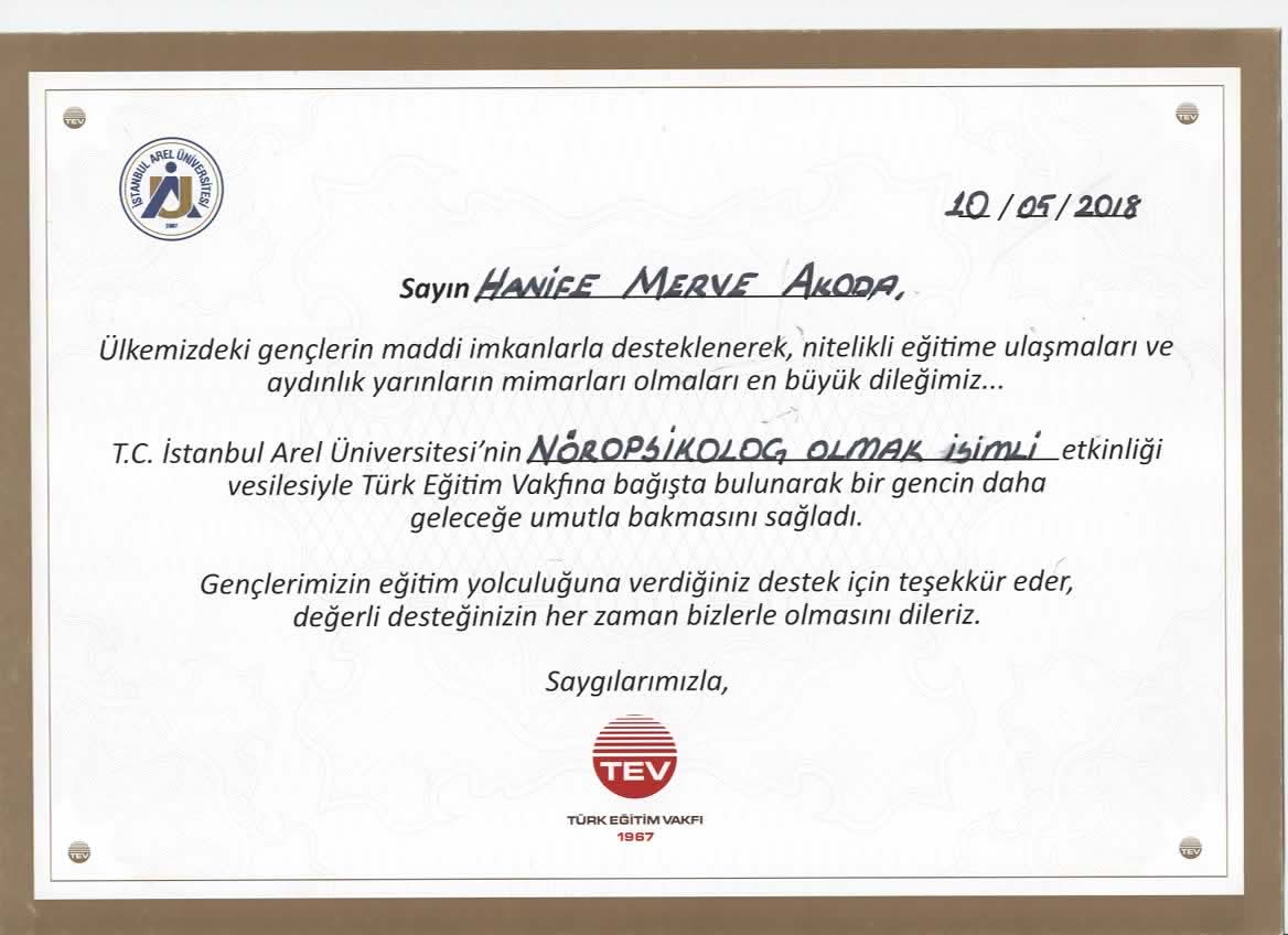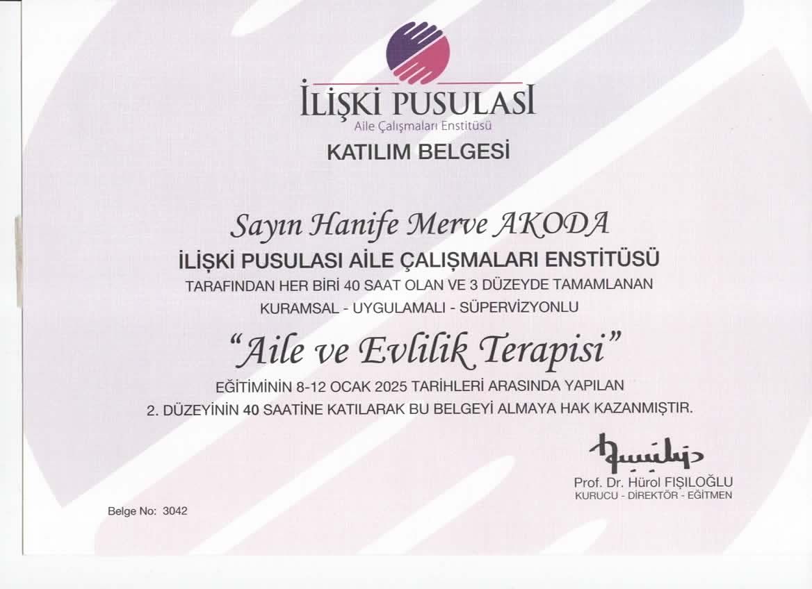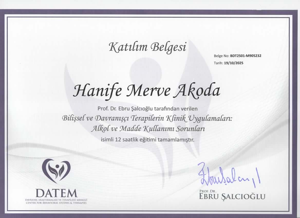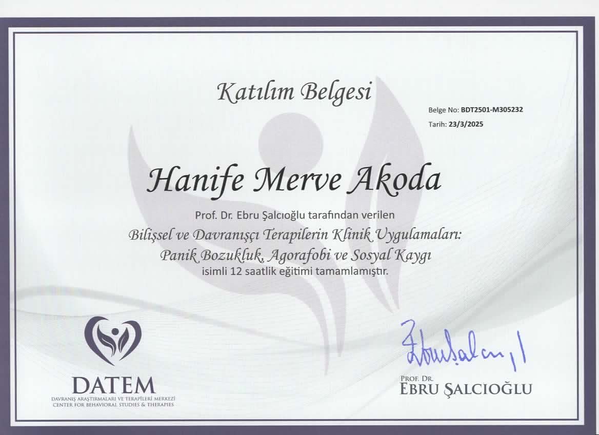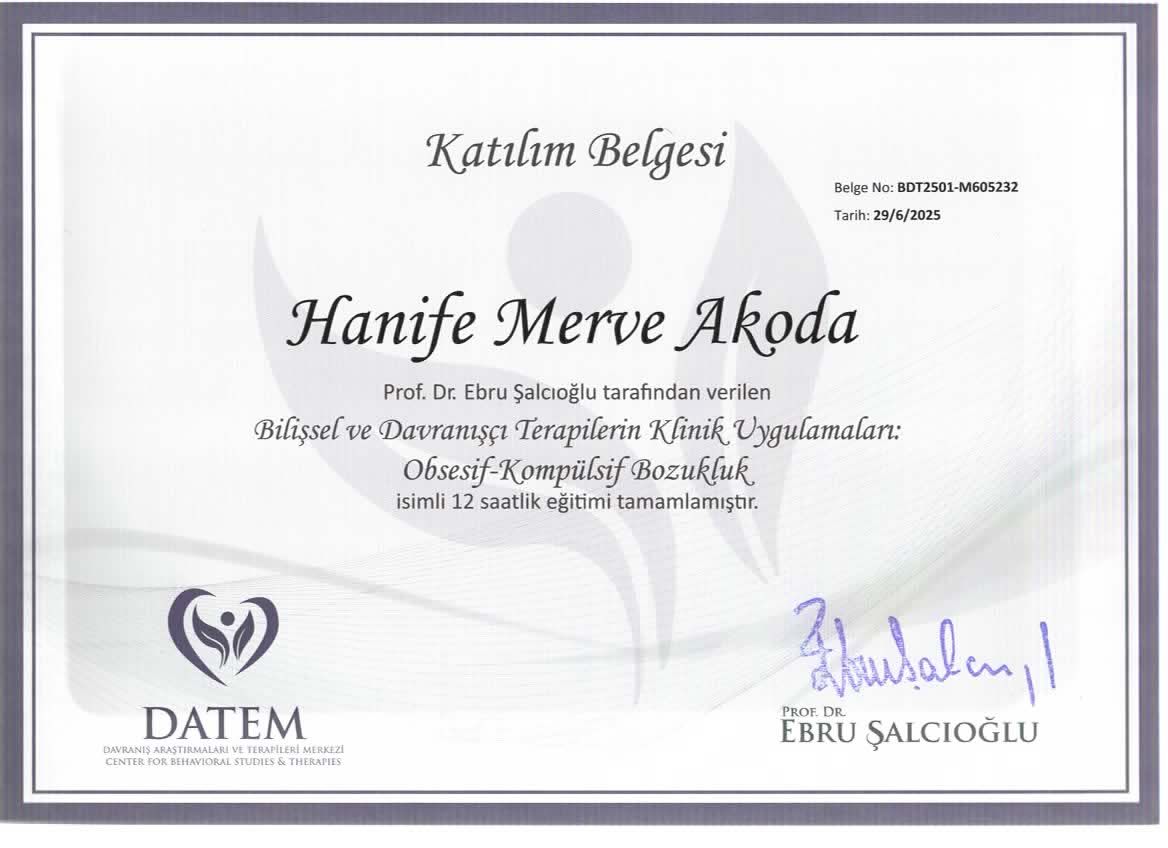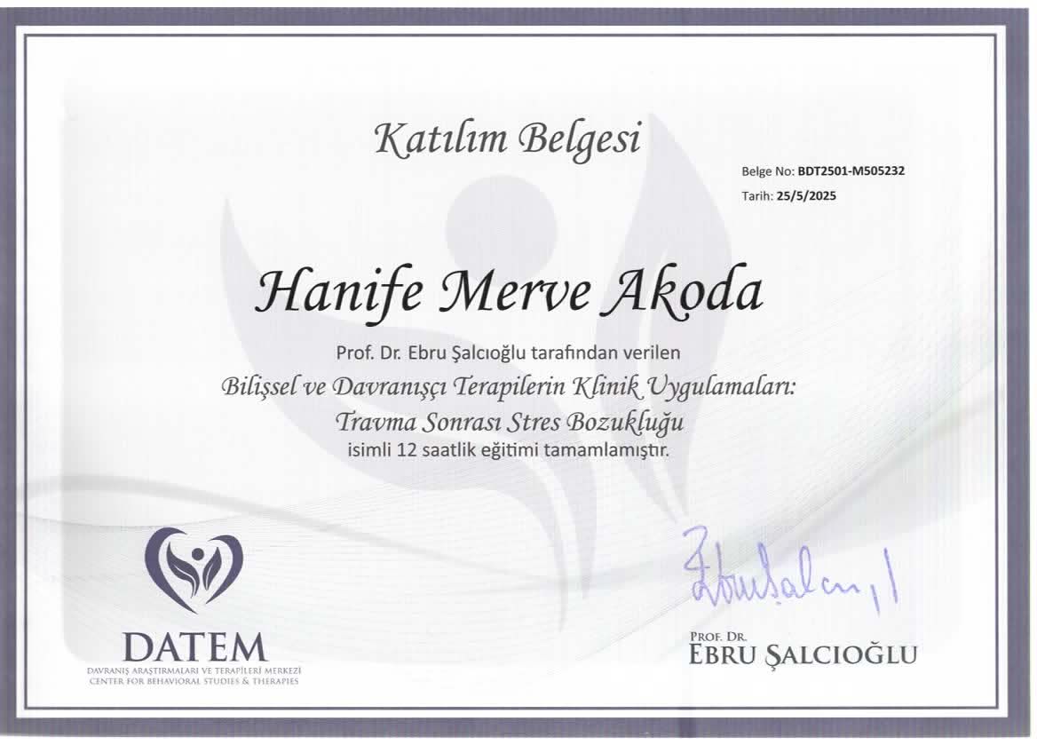 Kurucu Psikolog Hanife Merve Akoda MİA Psikolojik Danışmanlık ve Neurosound Dikkat Algı Geliştirme Merkezin de Hizmet vermektedir.