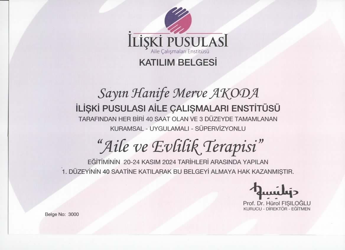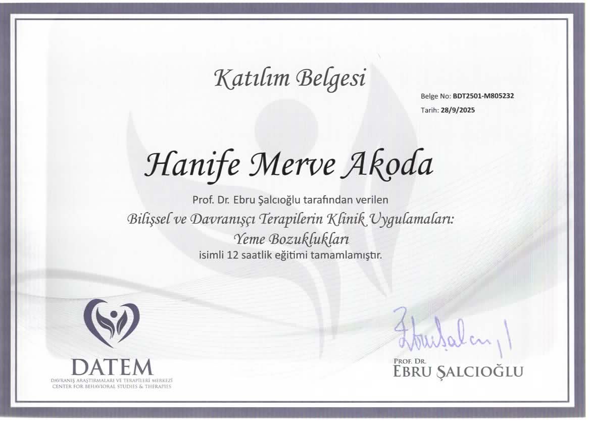 Adresine gitmek zorunda kalmadan Hanife Merve Akoda isimli uzmanla online görüşebilir miyim?Evet, Hanife Merve Akoda uzaktan danışmanlık sunuyor. Takvimden randevunuzu alırken "online danışmanlık" seçeneğini seçmeniz yeterli, uygun tarih ve saatleri görebileceksiniz.
