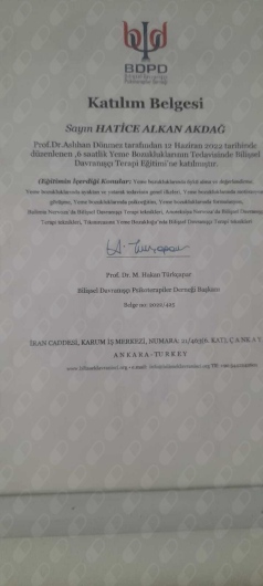 -Kognitif ve davranış terapileri kuramsal eğitimi (BDT) (Mart 2007- Temmuz 2008, 42 saat) Doç. Dr. Hakan Türkçapar