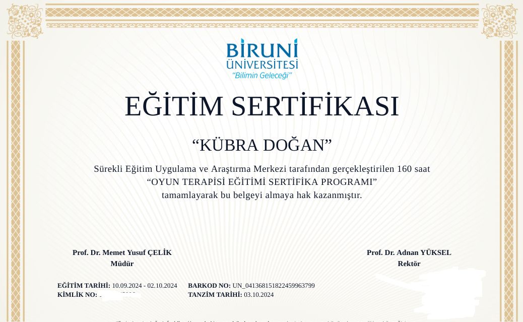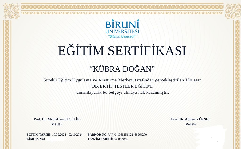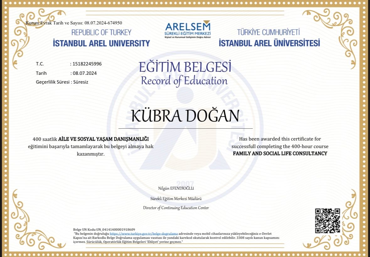 Mesleki gelişimime katkı sağlamak için birçok eğitim ve sertifika programına katıldım. İstanbul Arel Üniversitesi’nde Aile Danışmanlığı ve Bilişsel Davranışçı Terapi uygulayıcı eğitimlerimi tamamladım. Ayrıca Cinsel Terapi, Oyun Terapisi, Moxo Dikkat Testi, Objektif Testler, Aile ve Sosyal Yaşam Danışmanlığı gibi alanlarda belgelerim bulunmaktadır. Çocuklarla dikkat ve odaklanma becerilerini geliştirmeye yönelik Attentioner – Dikkatimi Topluyorum Programı eğitimi alarak uygulayıcı oldum.