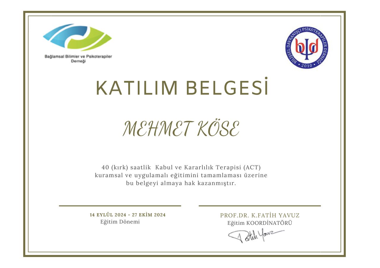 Psk. Mehmet KÖSE, 2020 yılında Muğla Sıtkı Koçman Üniversitesi Psikolojik Danışmanlık ve Rehberlik Bölümü’nden mezun olmuştur. Mezuniyetinin ardından 5 yıl boyunca çeşitli sivil toplum kuruluşlarında psikolojik danışman olarak görev almıştır.