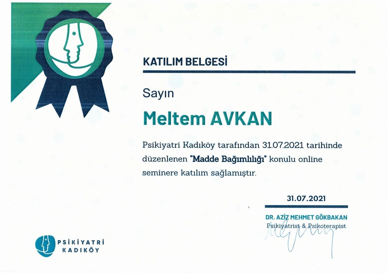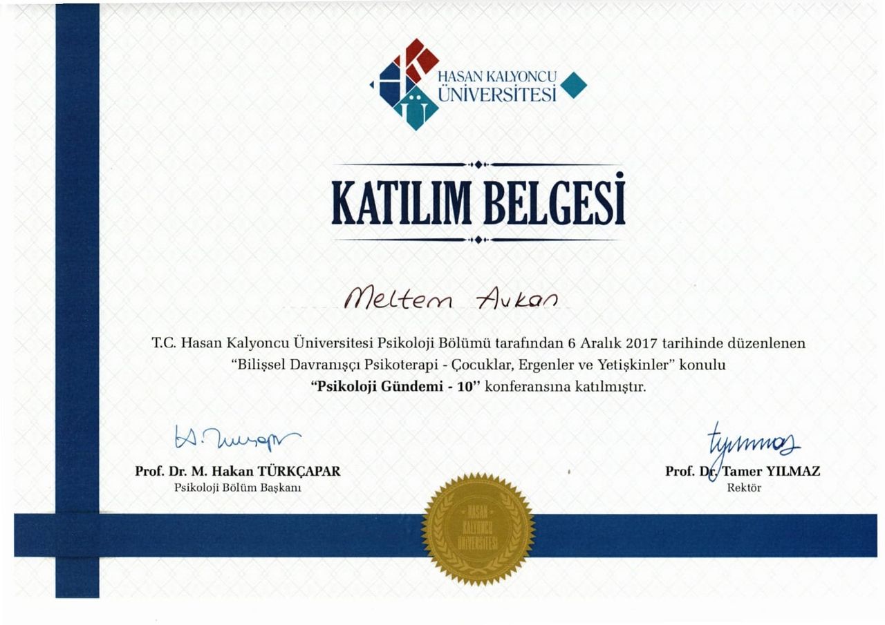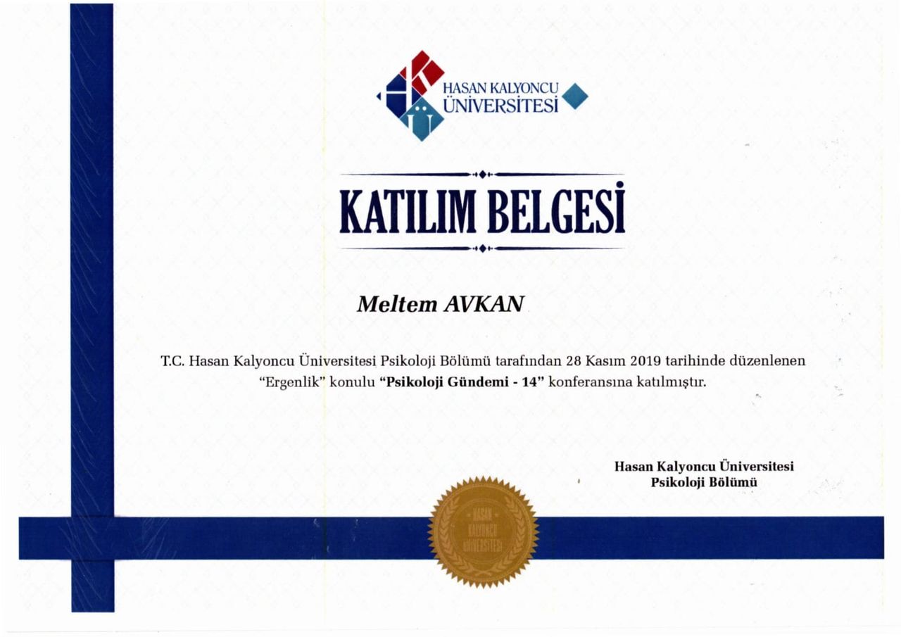 Varoluşçu Psikoterapi Derneği üyesi olarak Gaziantep’te verilen “Temel Varoluşçu Analiz Eğitimi” 08.10.2016 tarihinde almış olup 05.05.2018’de tamamlamıştır. Bunun yanı sıra “Hasan Kalyoncu Üniversitesi Klinik Psikoloji” anabilim dalından 31 Ocak 2019 güz döneminde mezun olmuştur. Ardından Şubat 2019- Mayıs 2019 tarihleri arasında Bilişsel Davranışçı Psikoterapiler Derneği’nin Beceri Kazandırma ve Süpervizyon eğitimine 30 saat katılmıştır.