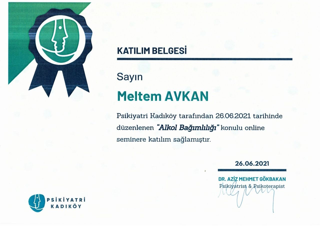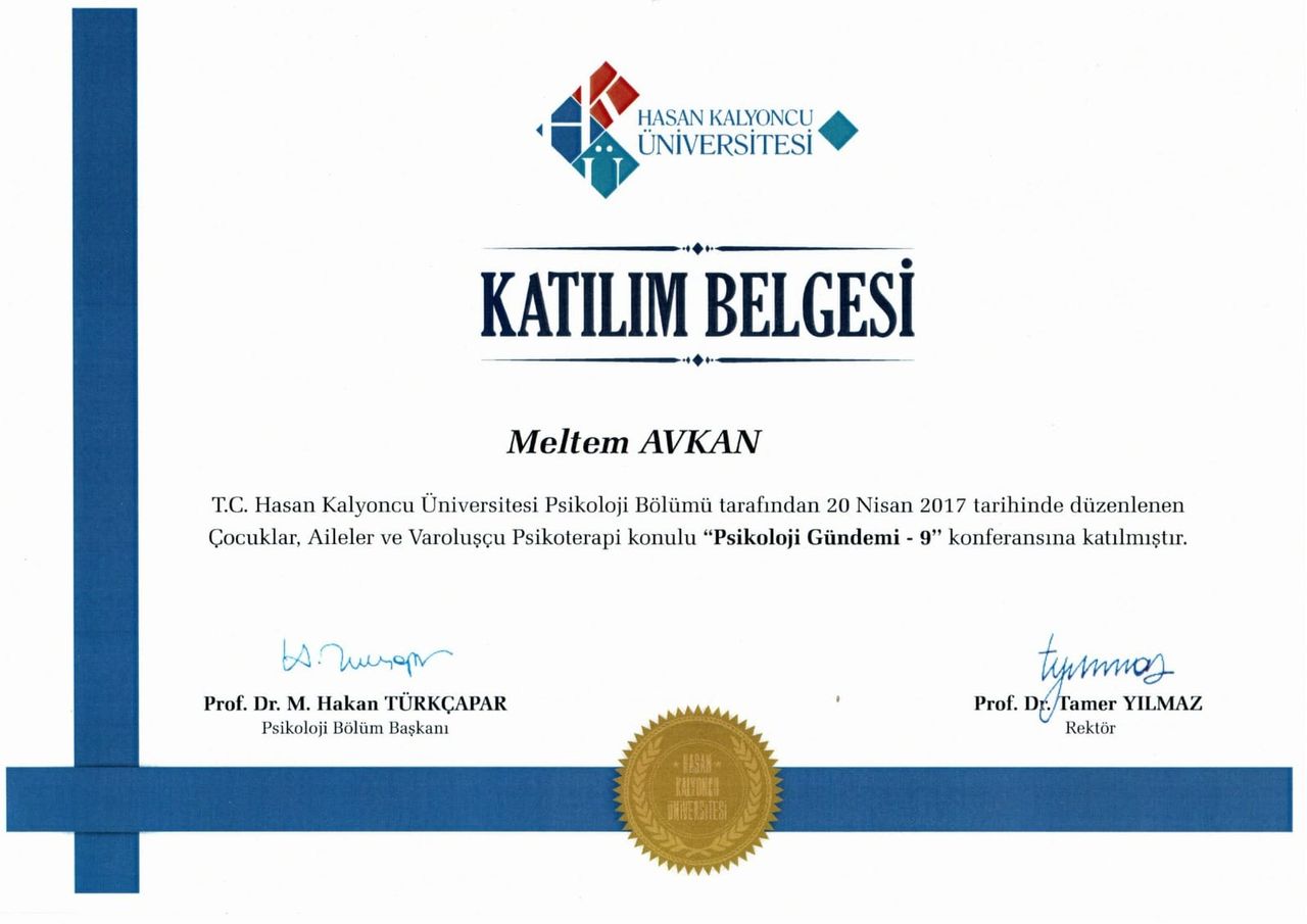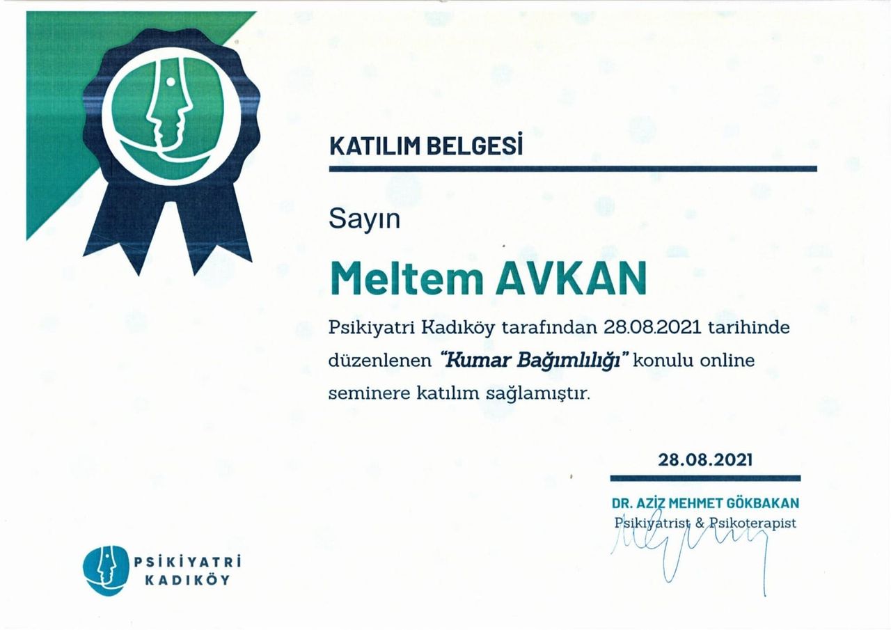 Varoluşçu Psikoterapi Derneği üyesi olarak Gaziantep’te verilen “Temel Varoluşçu Analiz Eğitimi” 08.10.2016 tarihinde almış olup 05.05.2018’de tamamlamıştır. Bunun yanı sıra “Hasan Kalyoncu Üniversitesi Klinik Psikoloji” anabilim dalından 31 Ocak 2019 güz döneminde mezun olmuştur. Ardından Şubat 2019- Mayıs 2019 tarihleri arasında Bilişsel Davranışçı Psikoterapiler Derneği’nin Beceri Kazandırma ve Süpervizyon eğitimine 30 saat katılmıştır.