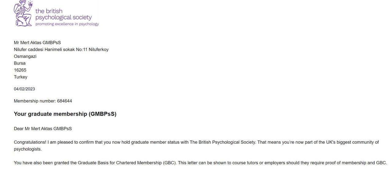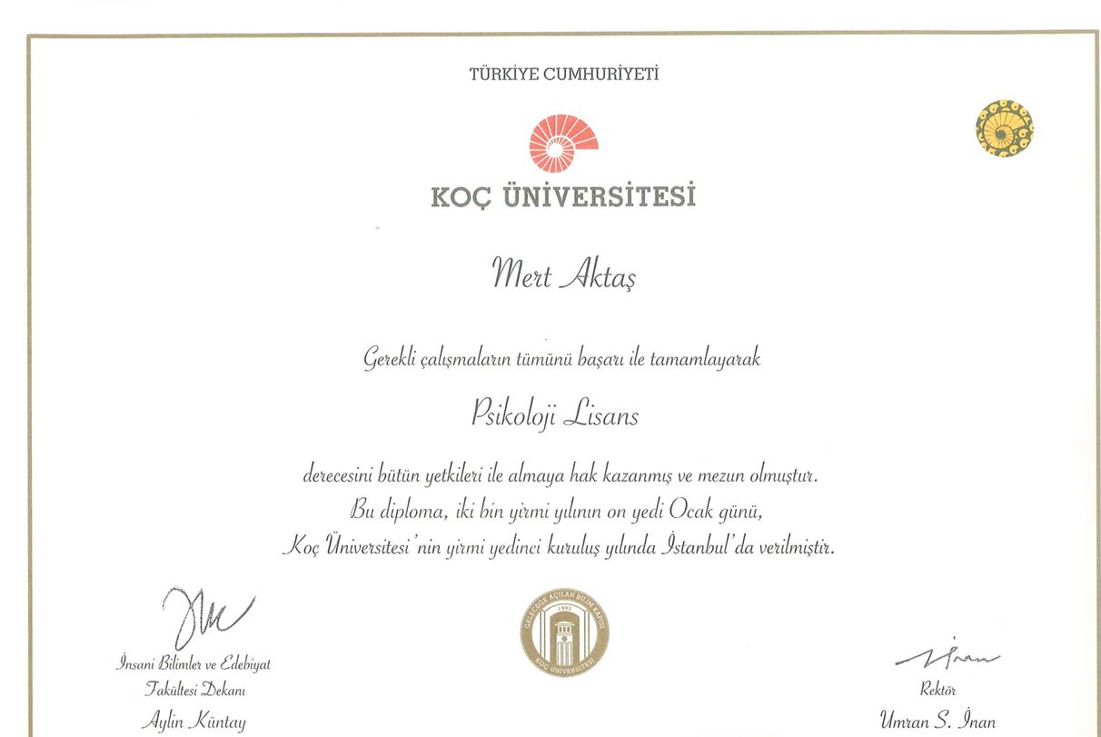 Psikoloji lisans eğitimimi Koç Üniversitesi’nde tamamladıktan sonra, İngiltere’de Bangor Üniversitesi’nde “Clinical and Health Psychology” alanında yüksek lisansımı üstün başarıyla tamamladım. Aldığım kapsamlı akademik ve uygulamalı eğitimlerin ardından YÖK tarafından denkliğim onaylanmıştır.