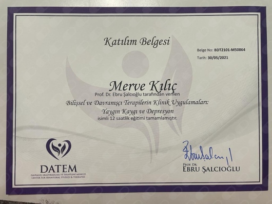 • Bilişisel Davranışı Terapi Eğitimi (Datem – Prof. Dr. Ebru Şalcıoğlu)