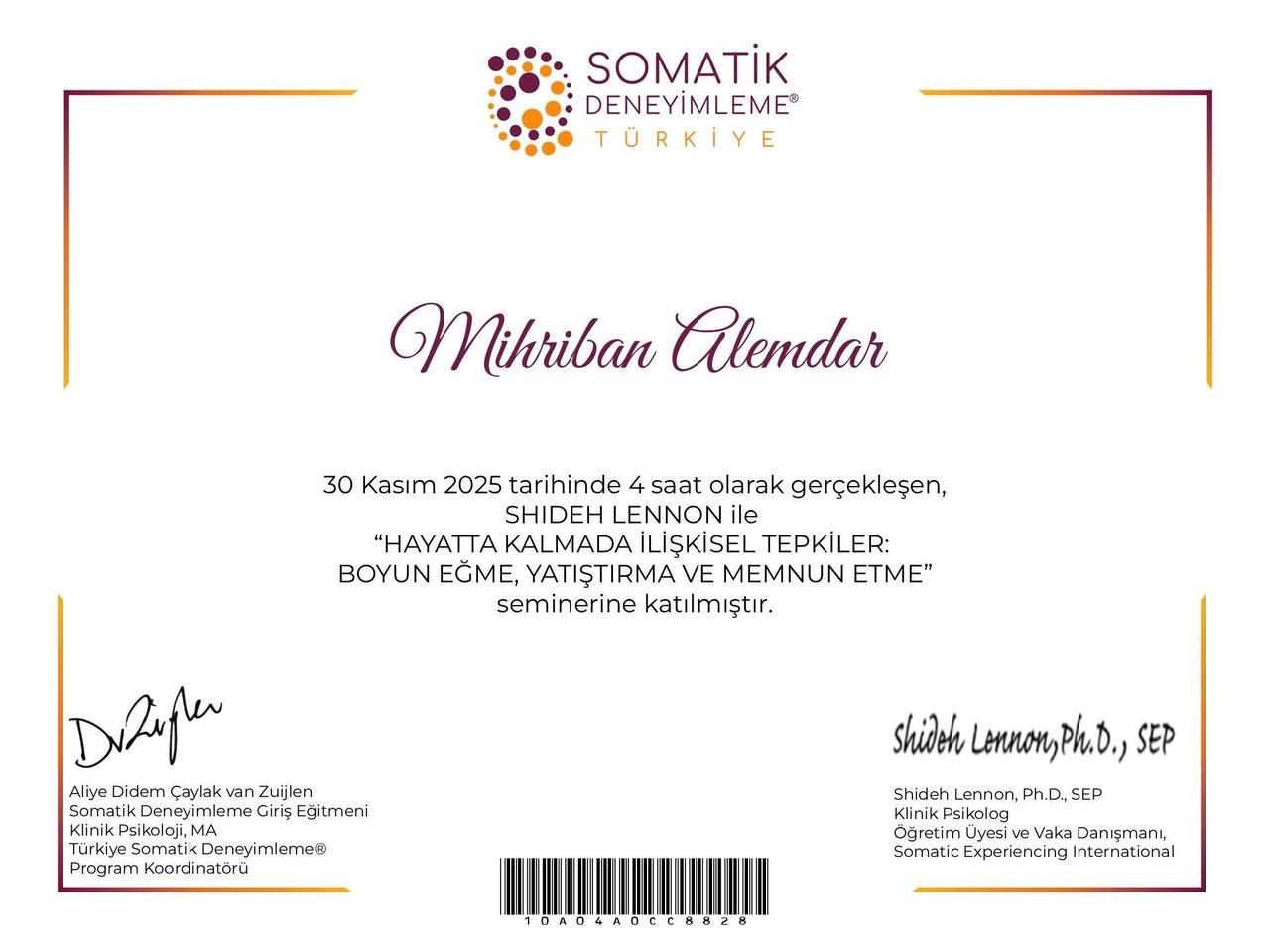 Halihazırda terapi eğitimlerime devam etmekte ve Uzm. Dr. Alp Karaosmanoğlu tarafından yürütülen "Şema Terapi" eğitimimi tamamlamış bulunmaktayım. Bunların yanı sıra nöropsikoloji alanında çeşitli çalışmalarda bulunmak ve bu konuda araştırmalar yapmak istemekteyim. Şu an klinik psikolog olarak çalışmakta olup, çocuk-ergen terapileri ve yetişkinlerde bireysel terapiler yürütmekteyim. Özellikle çocuklarda davranış bozuklukları, oyun terapisi, aile içi iletişim sorunları, ebeveyn danışmanlığı ve yetişkin terapileri (depresyon, kaygı bozuklukları, obsesif-kompülsif bozukluk, yeme bozuklukları, cinsel terapiler ve stres yönetimi) konusunda aktif olarak hizmet vermekteyim.