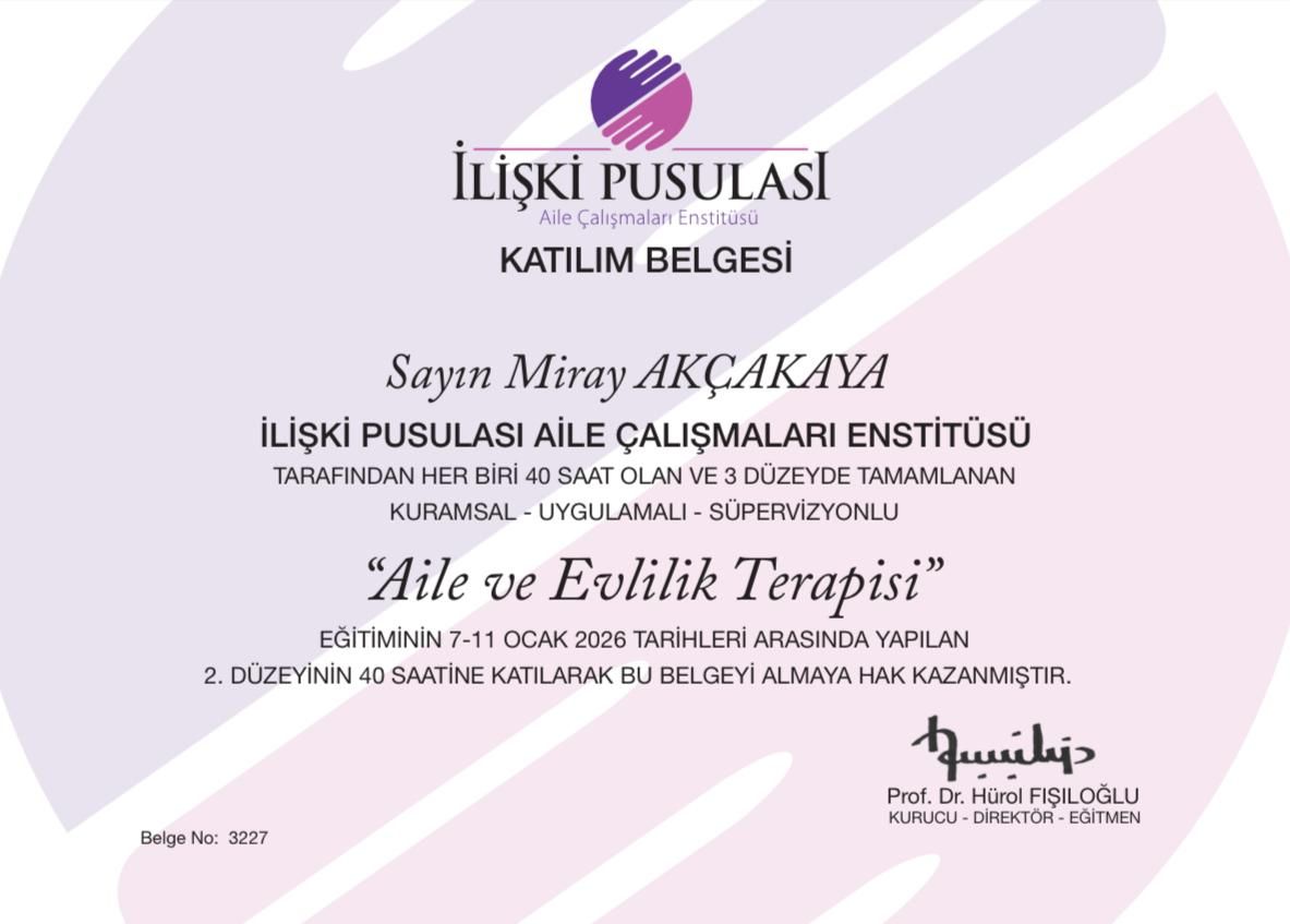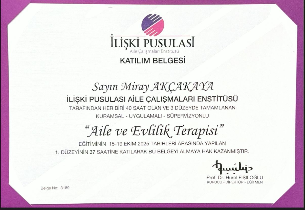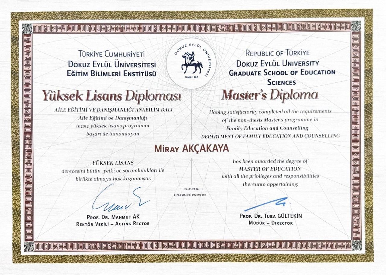 Merhaba, ben Psikolog-Aile ve Çift Danışmanı Miray Akçakaya. İzmir Ekonomi Üniversitesi Psikoloji Lisansı, Dokuz Eylül Üniversitesi Aile Eğitimi ve Danışmanlığı alanında Yüksek Lisans derecesi ile mezun oldum. Yetişkinler ve çiftlerle çalışmada uzmanlaşmış durumdayım.