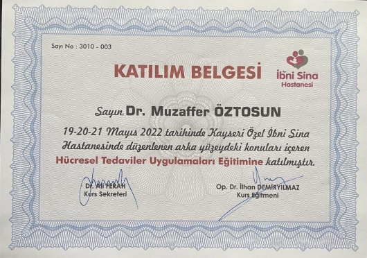 2015 yılından sonra Akupunktur, Kozmetik Akupunktur, YNSA Akupunktur, Kulak Akupunkturu, TCM Akupunkturu, Nöralterapi, Manuelterapi, Kinezyoloji, Ozonterapi, Kupaterapi, Homeopati, Viseral Osteopati, Radyestezi, Biyoenerji, Mezoterapi, PRP ve CGF(Kök Hücre Tedavisi)eğitimleri ile çok sayıda kongre sempozyum ve uygulamalı eğitimlere katılarak kendimi geliştirdim.