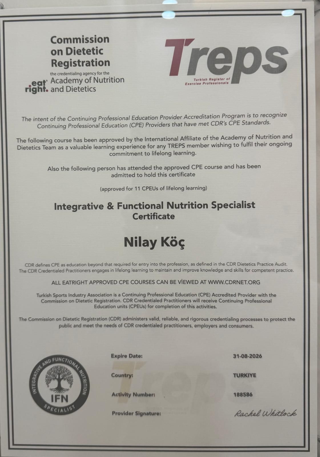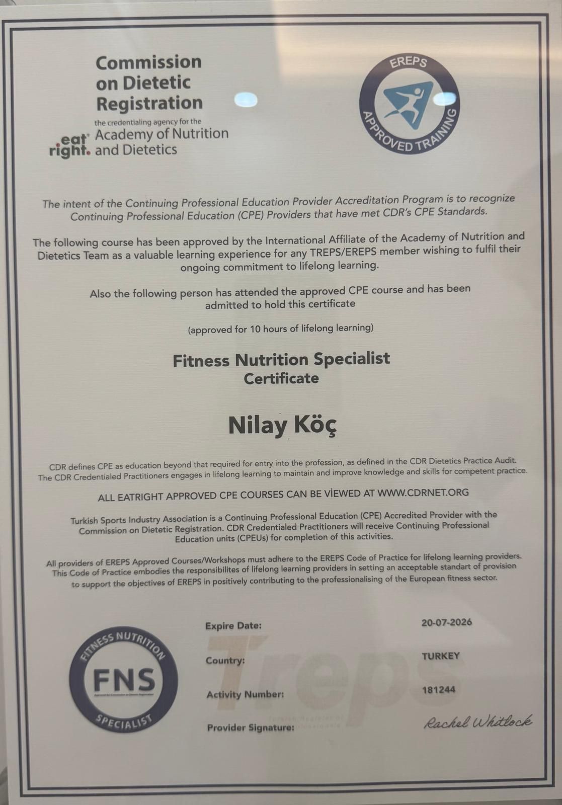 Mezuniyetimin ardından Diyetisyen Nilay Köç Online Beslenme Danışmanlığı bünyesinde online danışmanlık hizmeti vermeye başladım. Aynı zamanda B-fit spor salonunda yüz yüze danışan takibi yaparak sporcu ve aktif bireylerle çalışma fırsatı buldum. Şu anda İstanbul Üniversitesi Egzersiz ve Spor Bilimleri eğitimime devam etmekteyim.