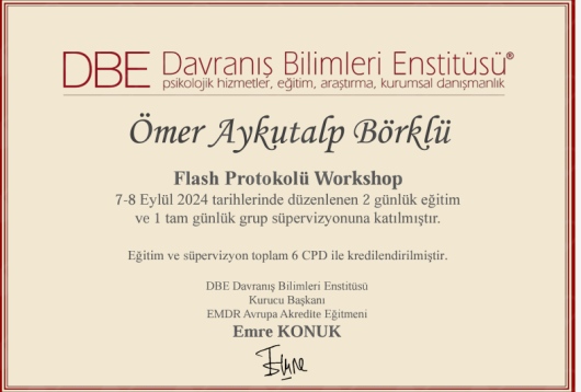 Daha sonra Davranış Bilimleri Enstitüsünden EMDR Terapisi Temel Eğitimimi tamamladım ve bu ekolde Süpervizyon eğitimi almaya başladım.