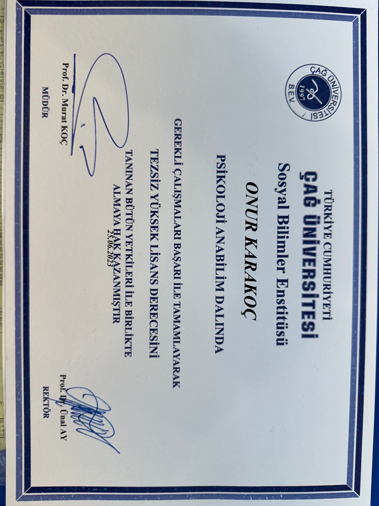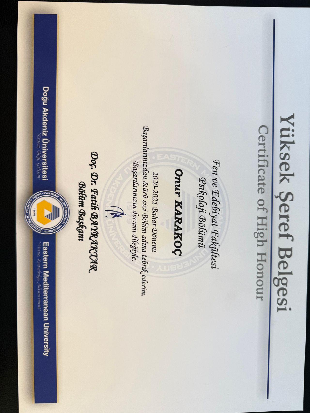 Uzman Psikolog Onur Karakoç, eğitim hayatına Mersin’de başlamış, lisans eğitimini Doğu Akdeniz Üniversitesi Psikoloji Bölümü’nde burslu olarak tamamlamıştır. Doğu Akdeniz Üniversitesi, dünya üniversiteleri sıralamasında ilk 1000 içerisinde yer almakta olup, Karakoç lisans öğrenimi süresince klinik psikoloji temelli çeşitli çalışmalarda aktif rol almıştır. Özellikle çocuk psikopatolojisi, depresyon, kaygı bozuklukları ve nöropsikoloji alanlarında teorik ve uygulamalı eğitimler almış, lisans derecesini şeref öğrencisi olarak tamamlamıştır.