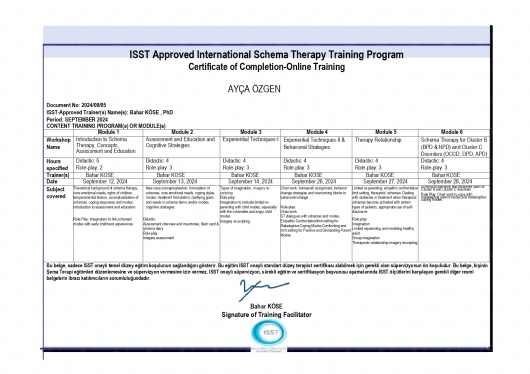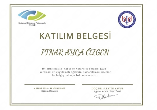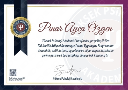 Uluslararası Onaylı Şema Terapi Temel Eğitimimi tamamladım ve şu anda onaylı şema terapisti olmak için süpervizyon kapsamında danışan görüyorum. Ayrıca ACT, BDT ve Çözüm Odaklı Terapi eğitimleriyle terapi becerilerimi geliştirdim.