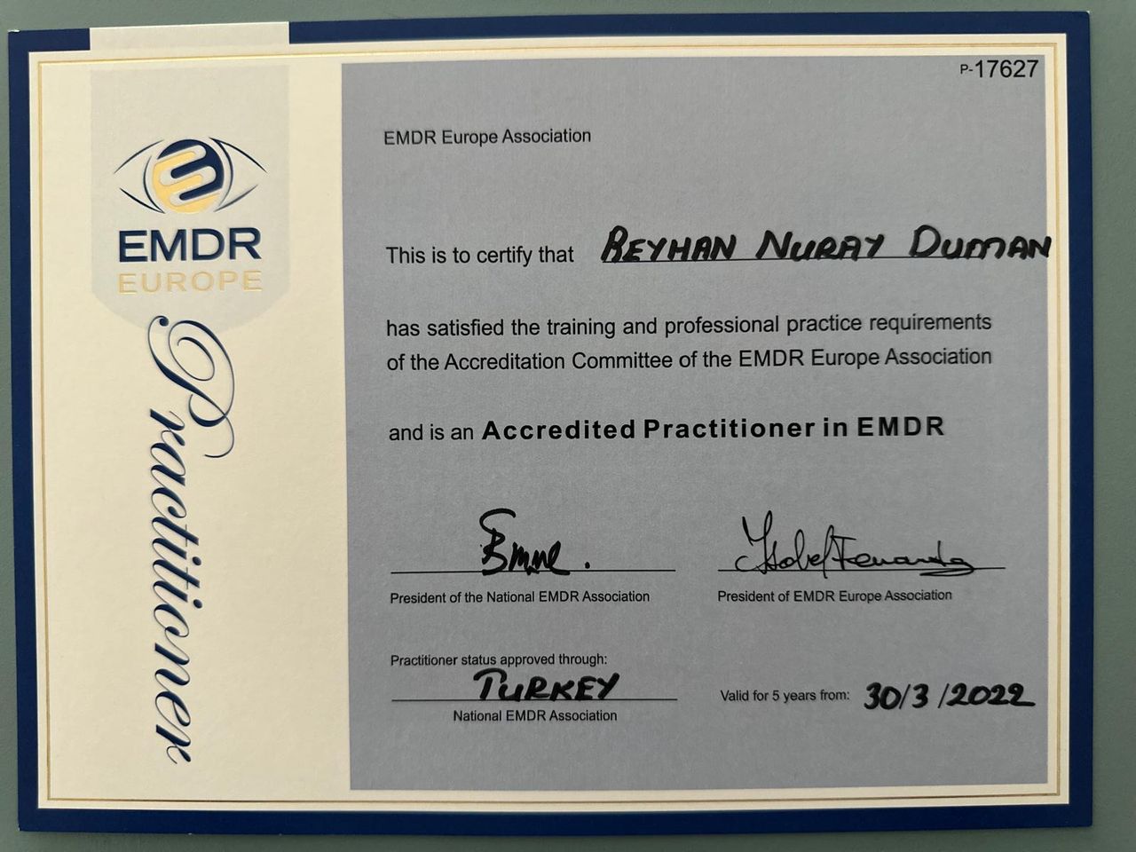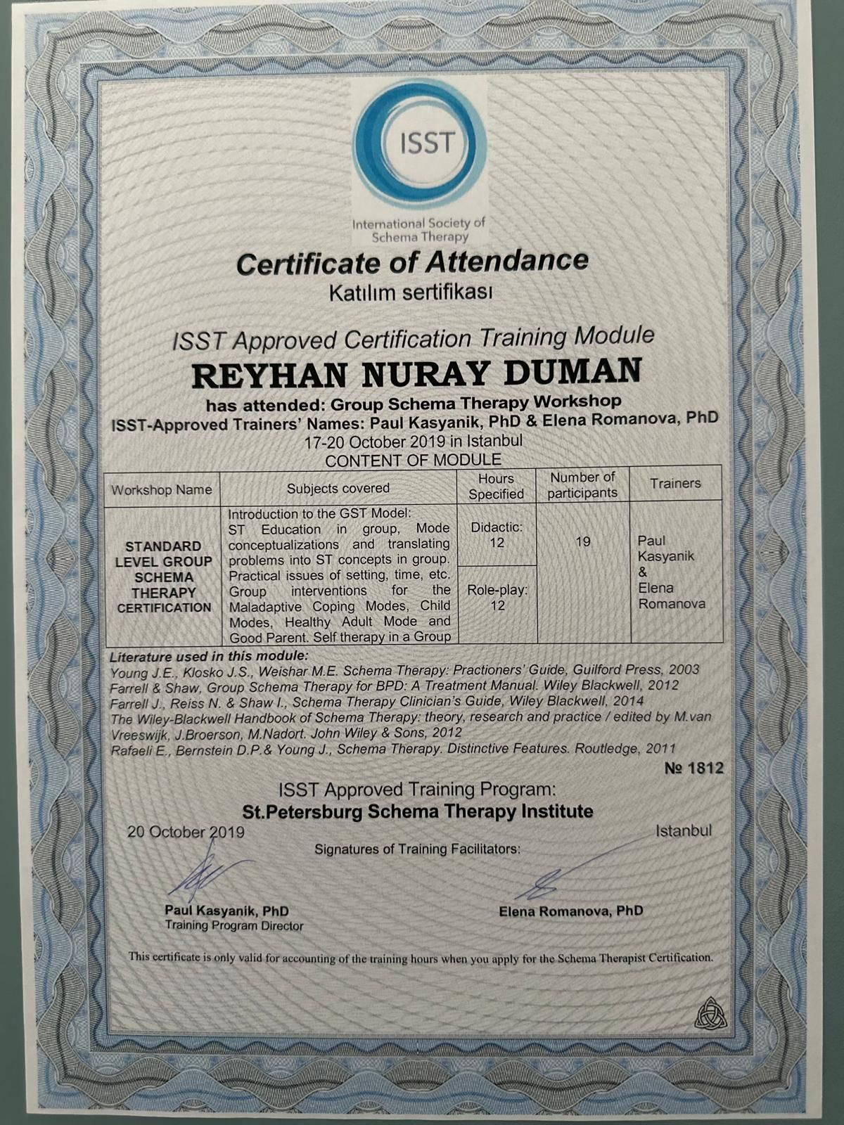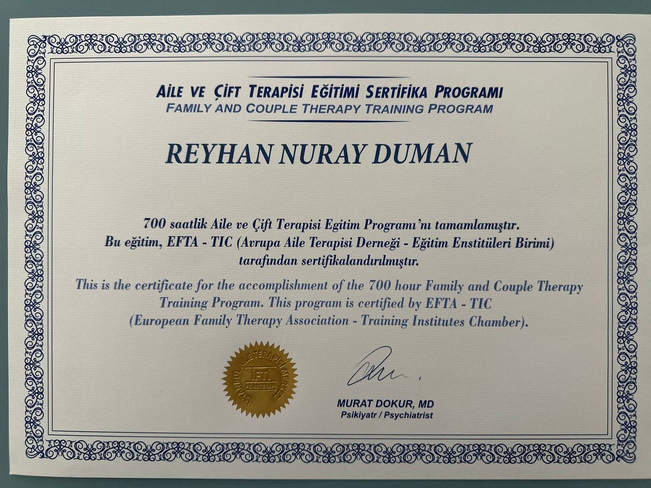 Reyhan Nuray Duman birçok farklı psikoterapi ekolüne yönelik uzman kişiler ve kurumlar tarafından verilen çok sayıda eğitim, seminer, konferans ,kongre ve workshoplara katılmıştır. Psikoterapi Enstitüsü tarafından verilen Bütüncül Psikoterapi Eğitimini tamamlamış ve aynı eğitimin eğitmen kadrosundadır. Murat Dokur eğitmenliğinde yürütülen European Family Therapy Association (EFTA) -Training Instıtutes Chamber (Avrupa Aile Terapisi Derneği Eğitim Birimi) tarafından onaylı Çift ve Aile Terapistliği Eğitimini tamamlamıştır. EFTA onaylı çift aile terapistidir. İstanbul Psikodrama Enstitüsü’nde başladığı psikodrama egitiminin temel aşamalarından mezun olup co- psikodramatist ünvanına sahip olmuştur. Psikodrama eğitiminin üst aşamasına halen devam etmektedir. ISST onaylı Şema terapisti , EMDR Avrupa Onaylı EMDR terapisti ünvanı olan Duman Bilişsel Davranışçı Terapi, Şema Terapi, EMDR, Somatik Deneyimleme, Bütüncül Psikoterapi, Çift ve Aile Terapileri ve Psikodrama eğitimleri kapsamında 1000 saatin üzerinde süpervizyon eğitimi almıştır.